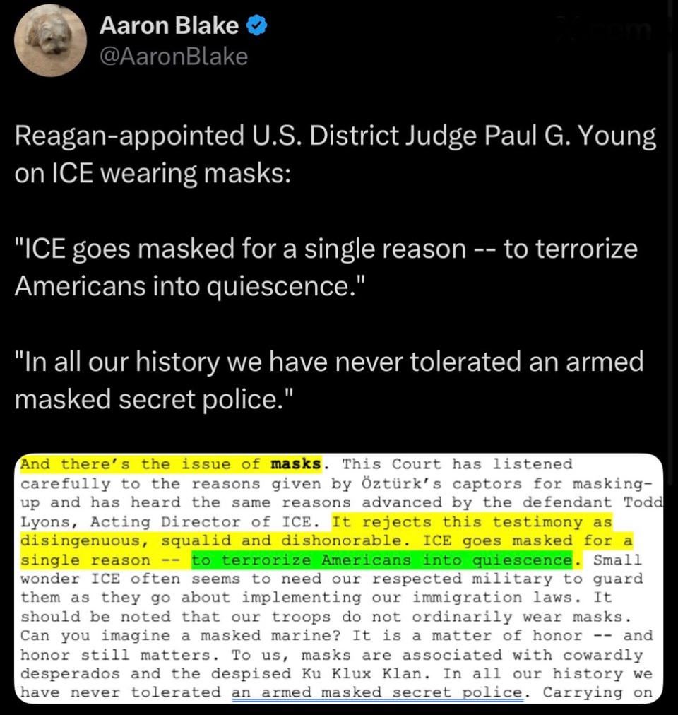 “ICE goes masked for a single reason - to terrorize Americans into quiescence,” says the Reagan appointed judge. (Link below)