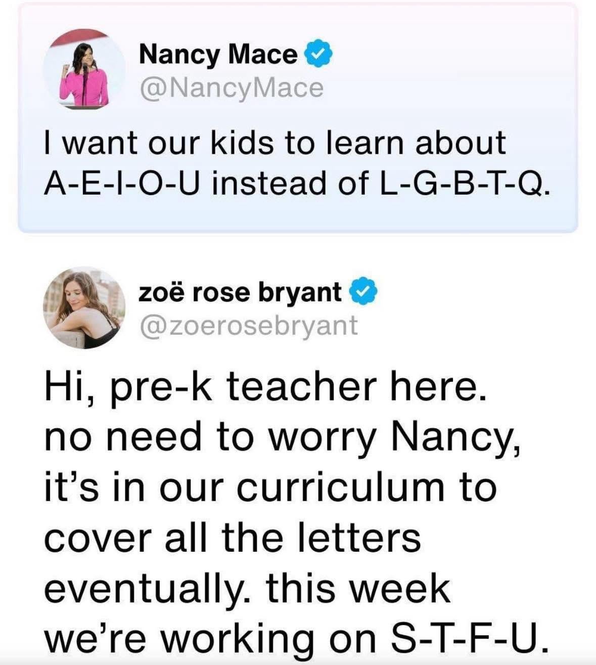She’s just reciting the alphabet, Nancy.