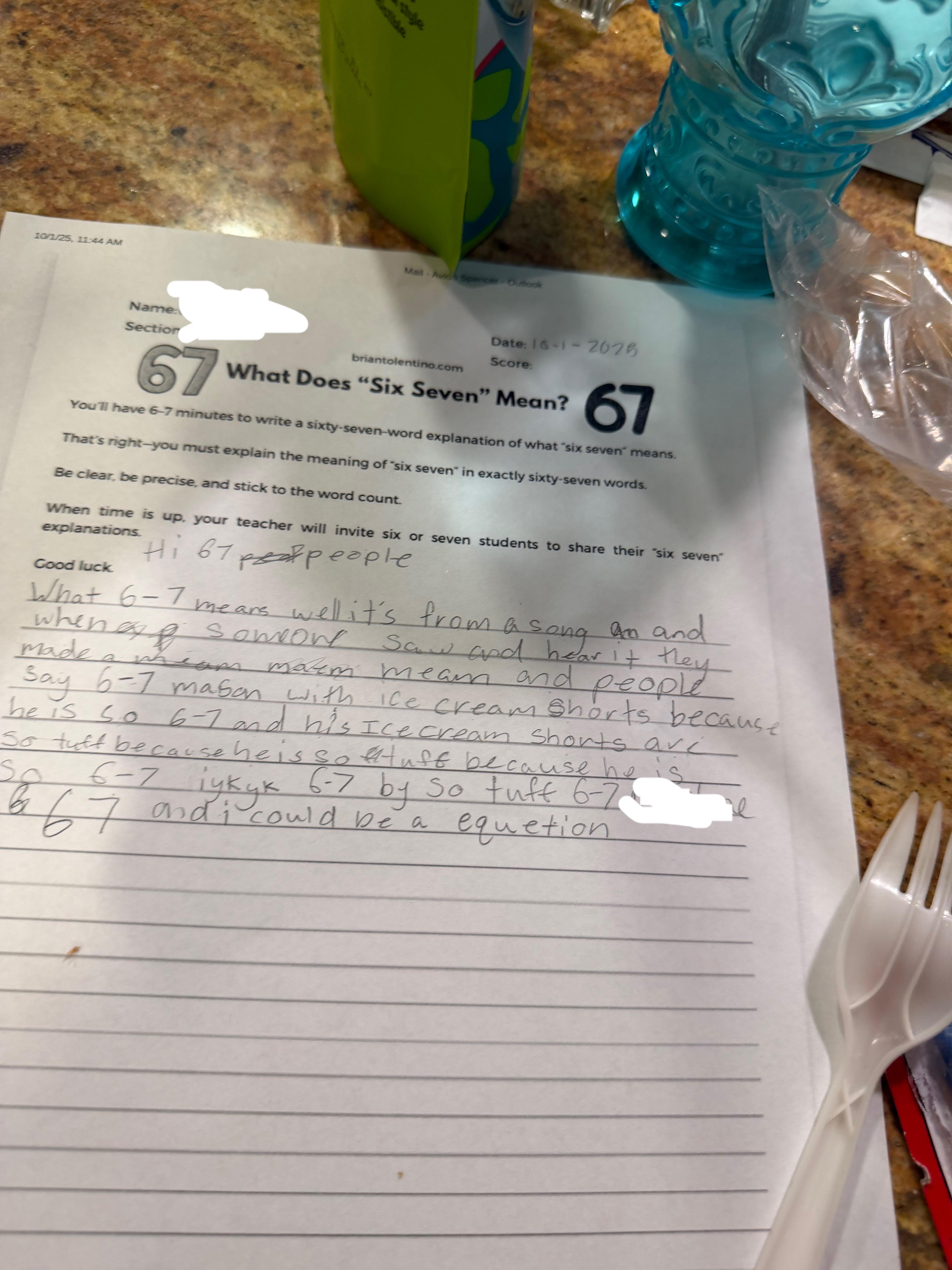 Tell me why my lil cousin has homework about 67