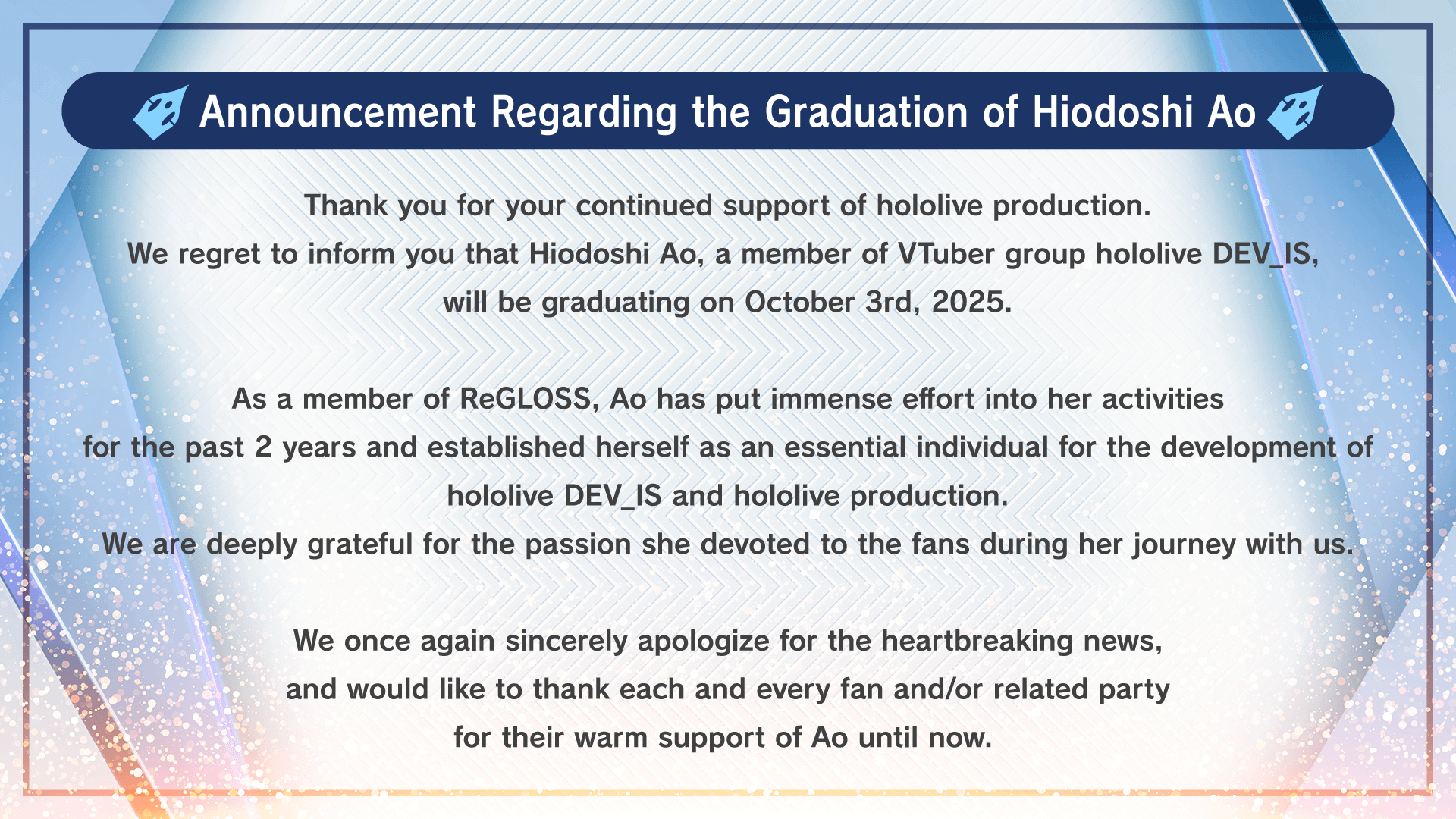 [Announcement Regarding Hiodoshi Ao's Graduation]