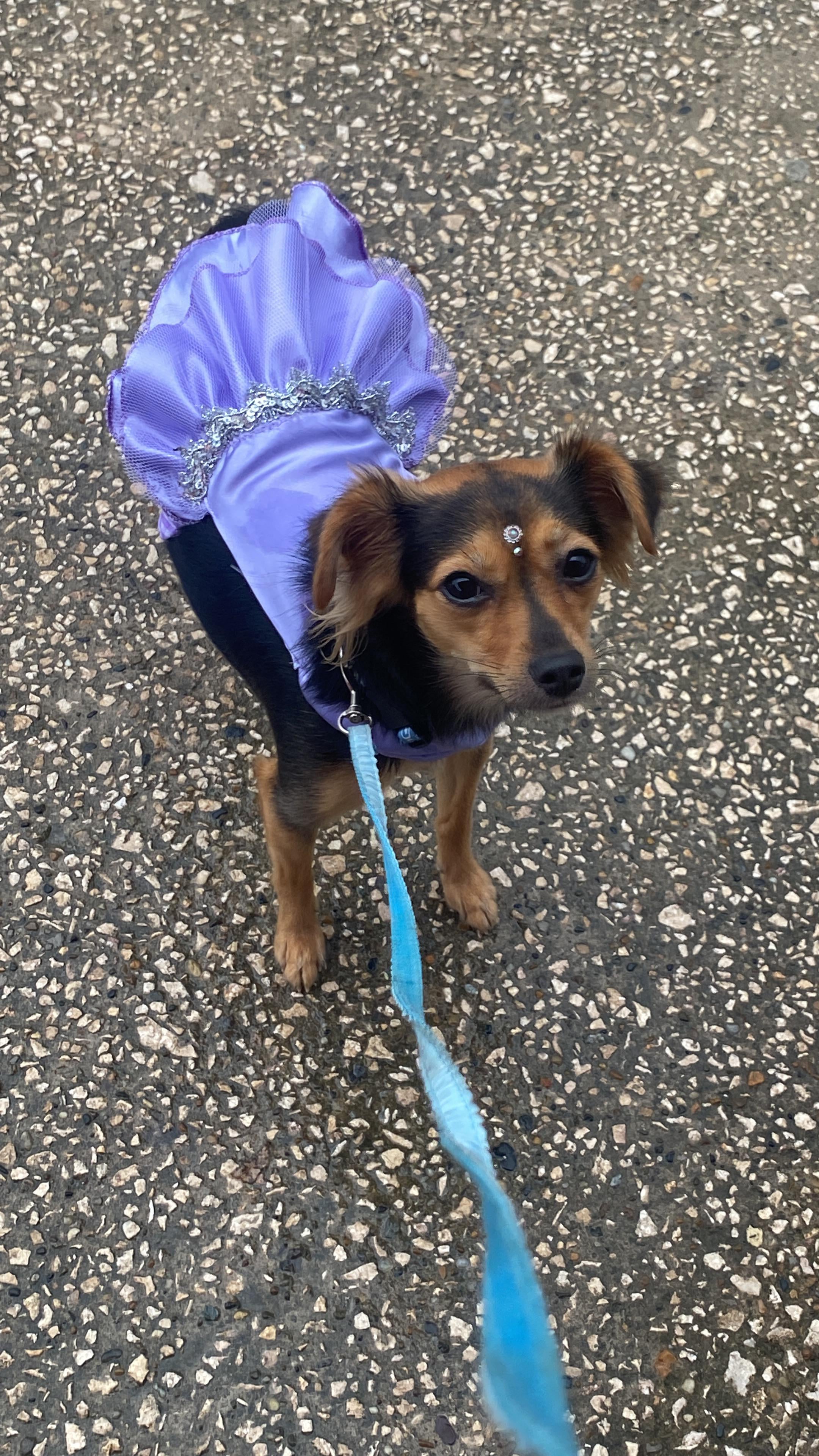 She goes for a walk with her dress made by her grandmother