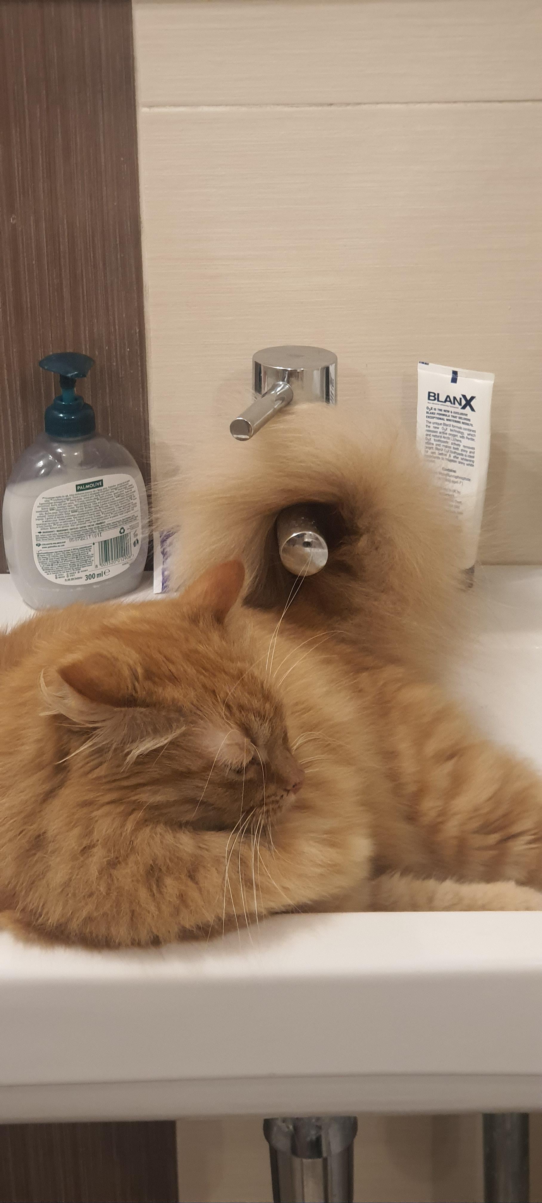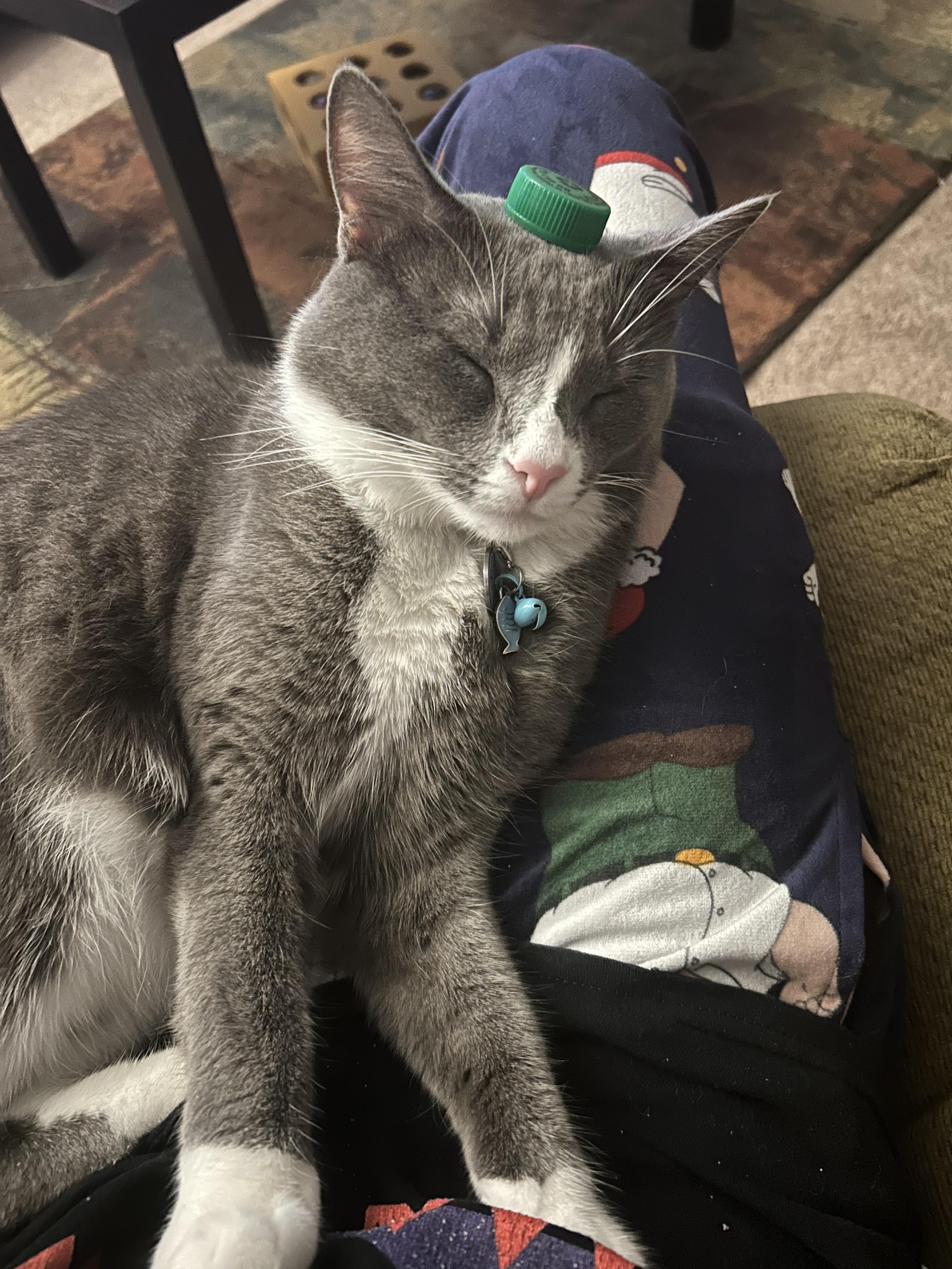 He fell asleep like this, so I gave him a little hat