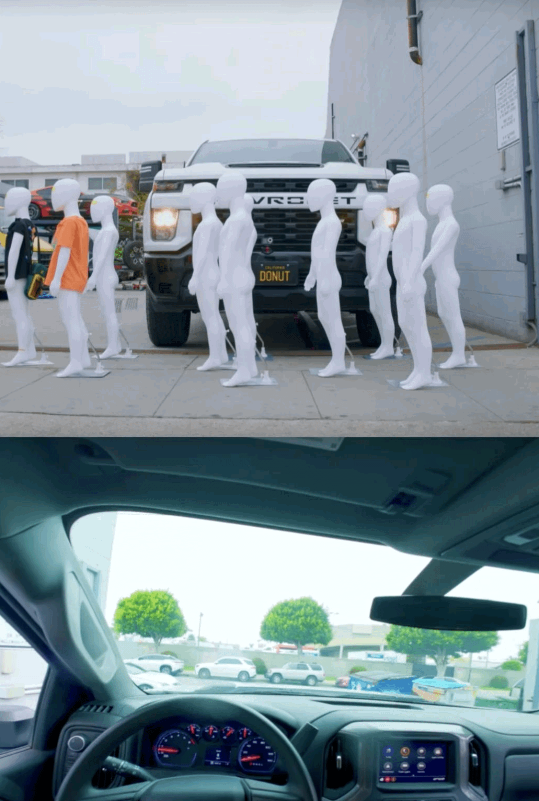 None of the child size dummies in the top picture are visible from the truck driver POV. The truck itself does not have any safety sensors on the front and the seat height cannot be adjusted.