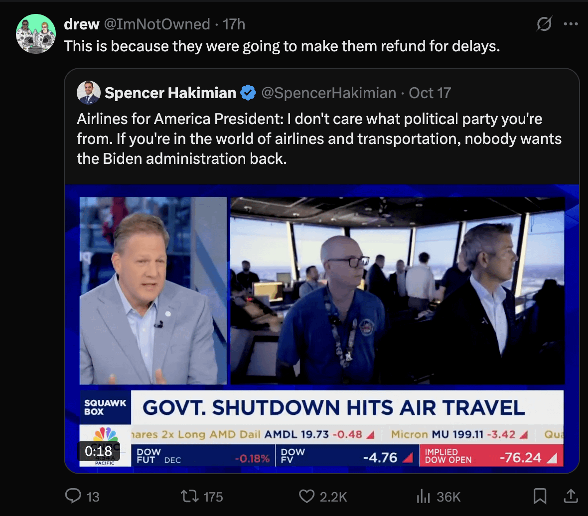 President Biden was trying to get airlines to have to PAY passengers for unreasonable delays and cancellations, of course they don't want him back -- he was holding them accountable!