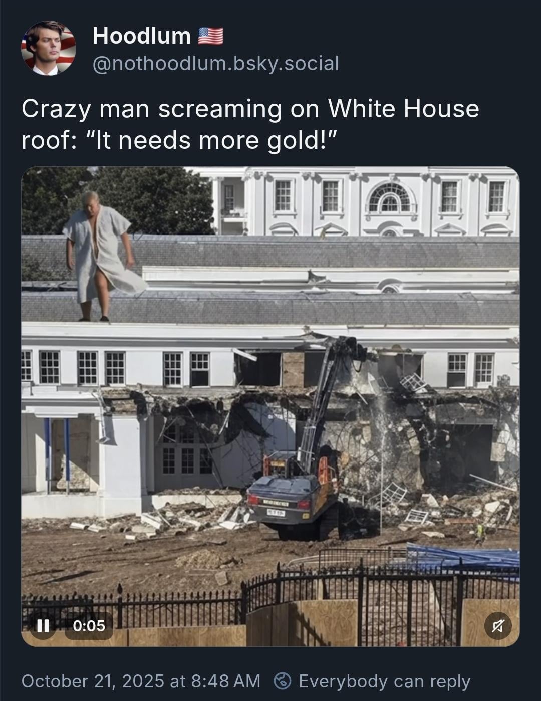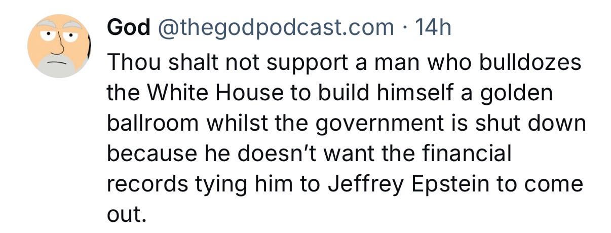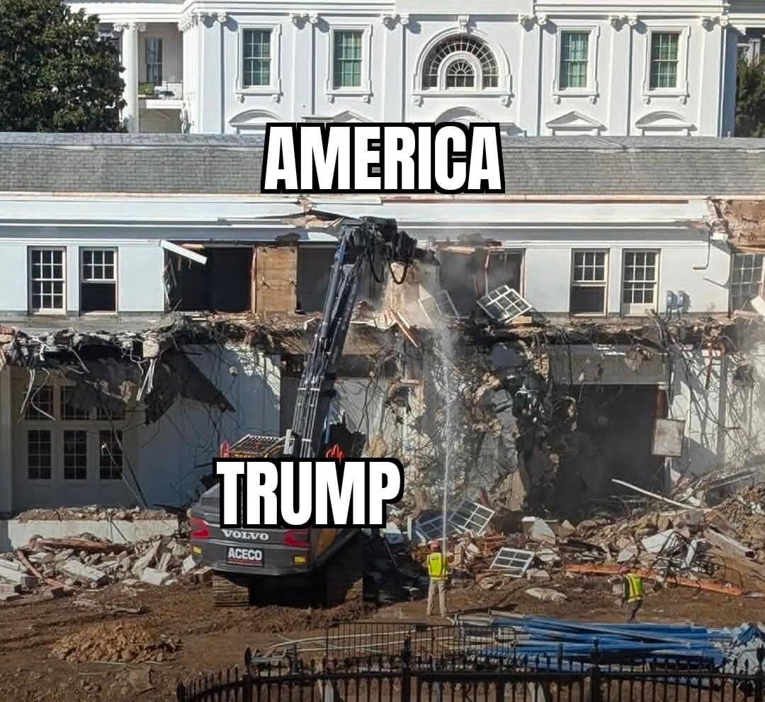 Bulldozing the WH for a tacky golden ballroom. It is NOT his house. Release the Epstein files.