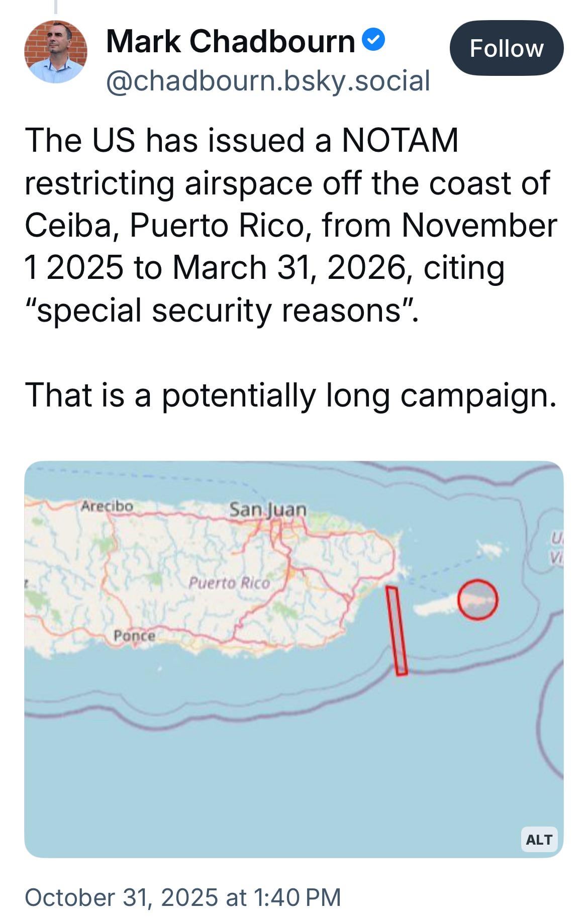 US restricting airspace off coast of Ceiba, Puerto Rico