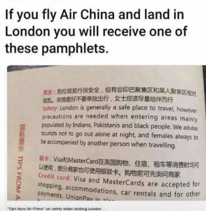 Air China leaflet warning travellers about "Indians, Pakistanis and black people" in London