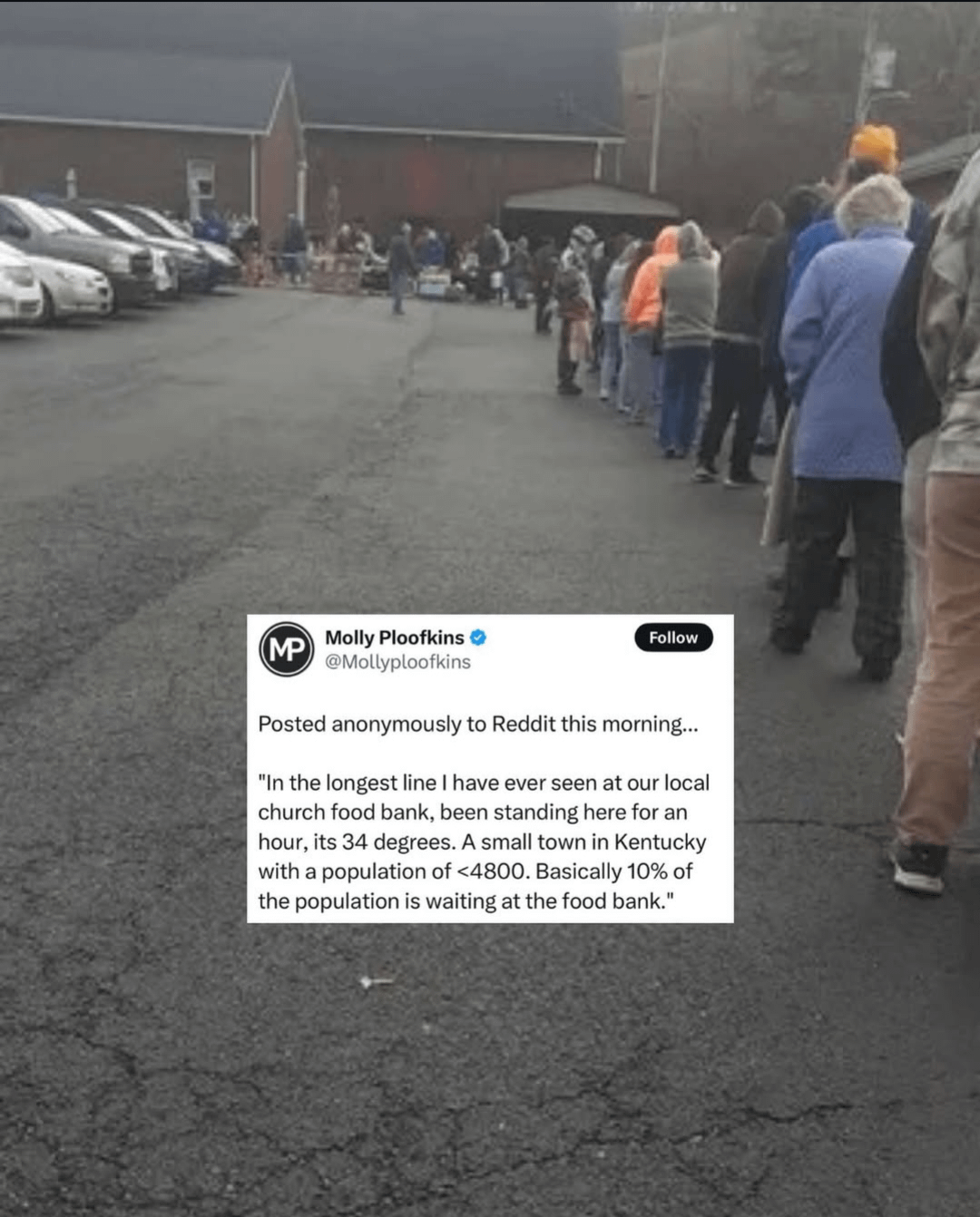 Long food bank lines reported in small Kentucky town; residents say up to 10% of population waiting for assistance.