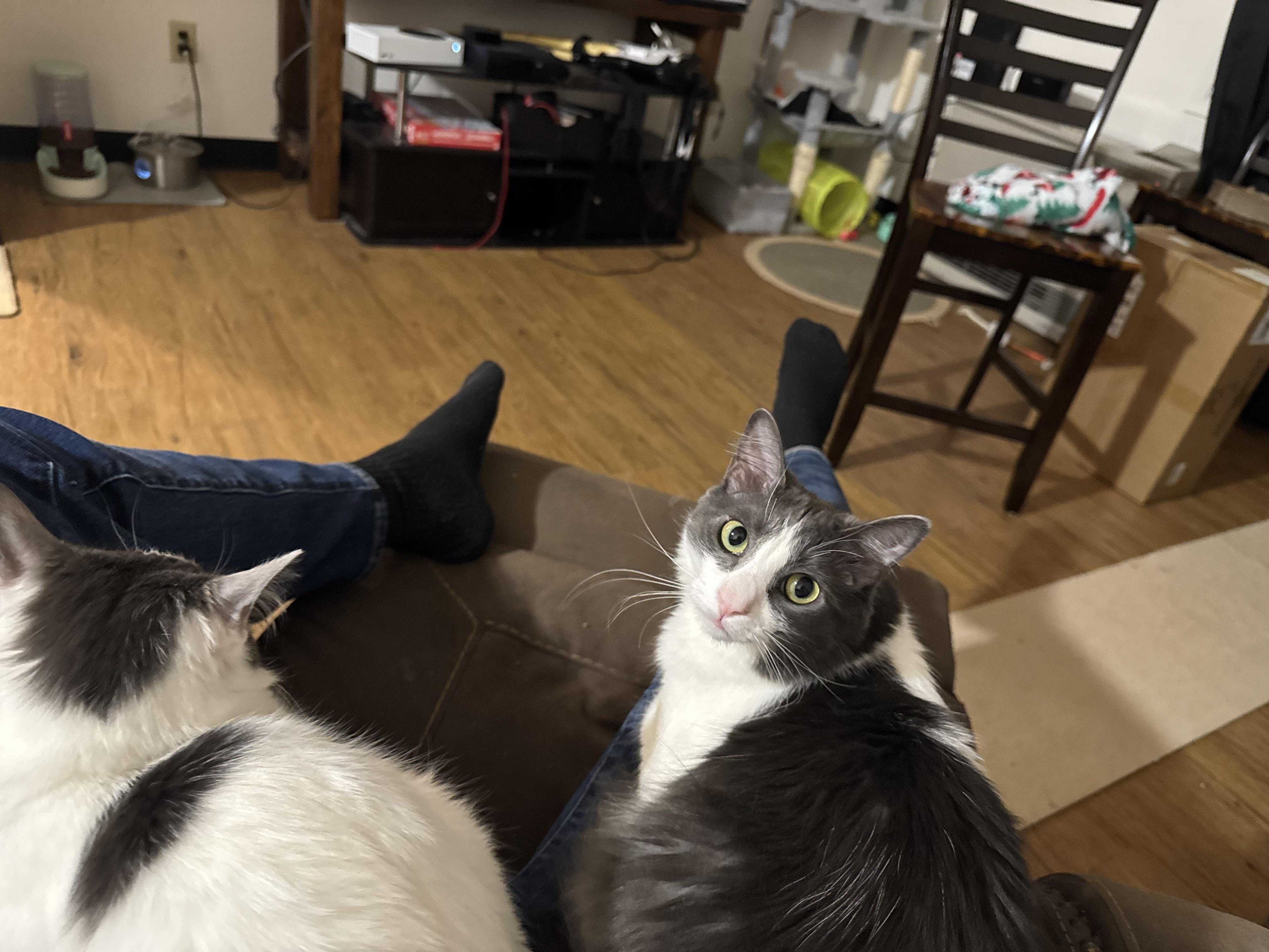 Everyday I get home this is them within 5 minutes , they both pick a leg.