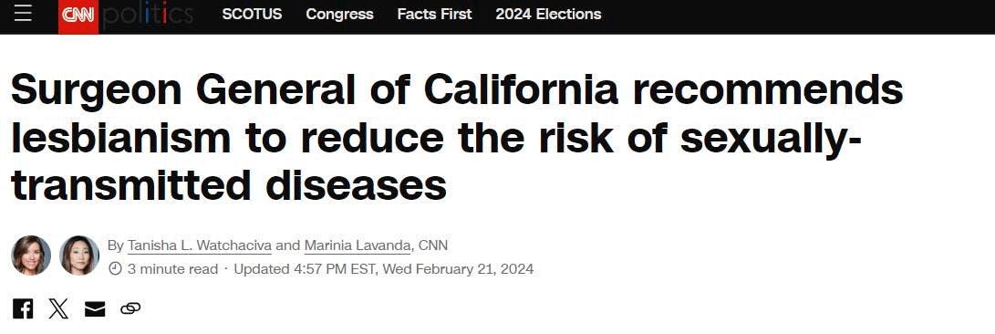 Surgeon General of California recommends lesbianism to reduce the risk of STDs.
