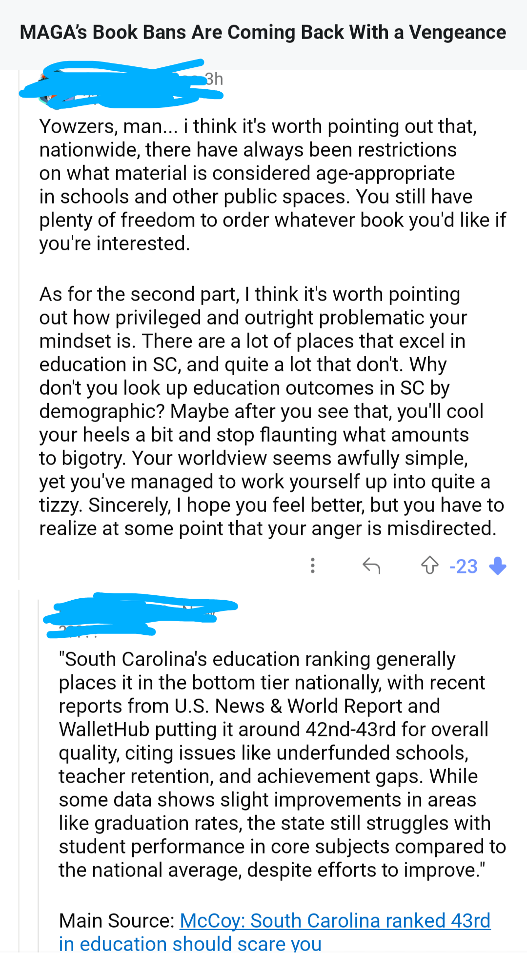 User tries to defend Anne Frank and 1984 being banned by pointing at excellent education outcomes that don't exist.