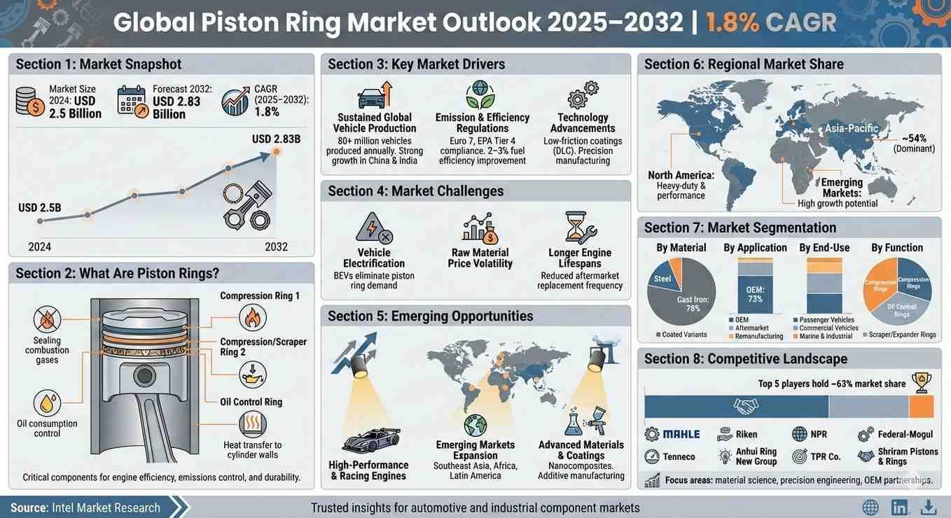 Global Piston Ring Market Outlook 2025–2032 | Steady Growth at 1.8% CAGR global piston ring market was valued at USD 2.5 billion in 2024 and is expected to reach USD 2.83 billion by 2032, expanding at a CAGR of 1.8%. Growth is supported by sustained global vehicle production, especially in emerging economies, and the need for advanced engine components to meet stringent emission and efficiency regulations. Despite long-term challenges from vehicle electrification, demand remains resilient across automotive, commercial, marine, and industrial engine applications.