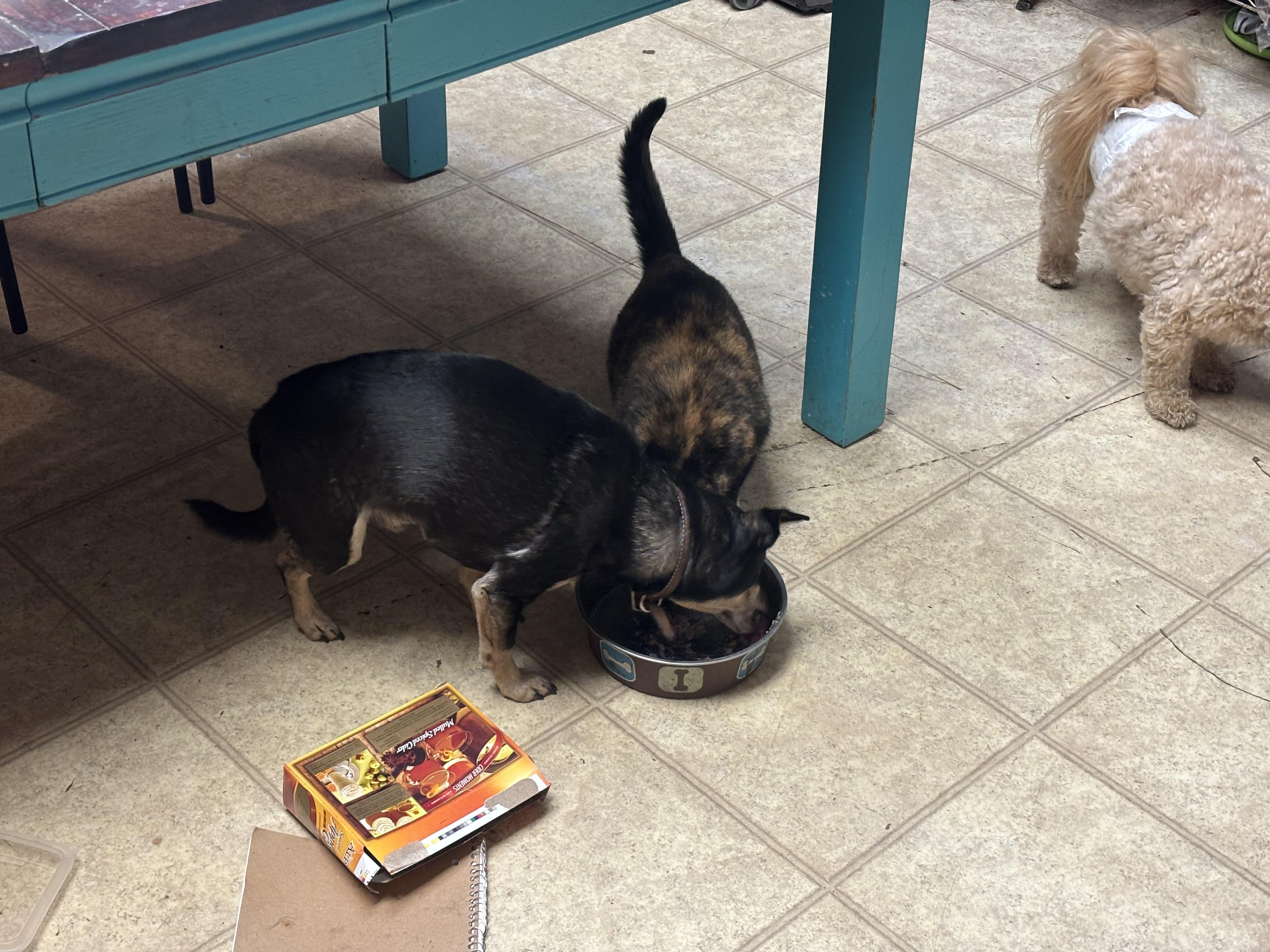 My cat and dog eating together