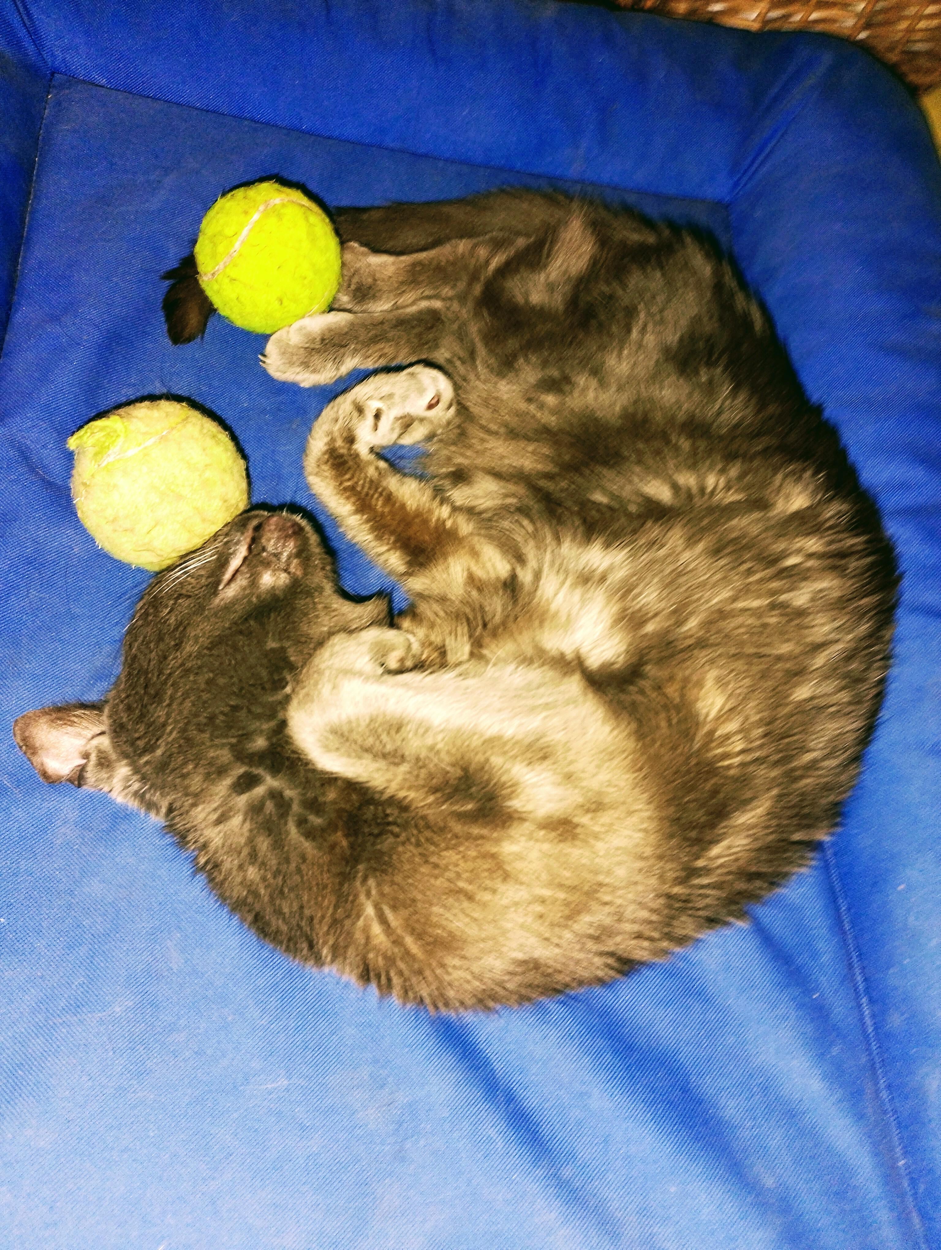 My lady cat loves to steal the puppy balls to sleep deeply