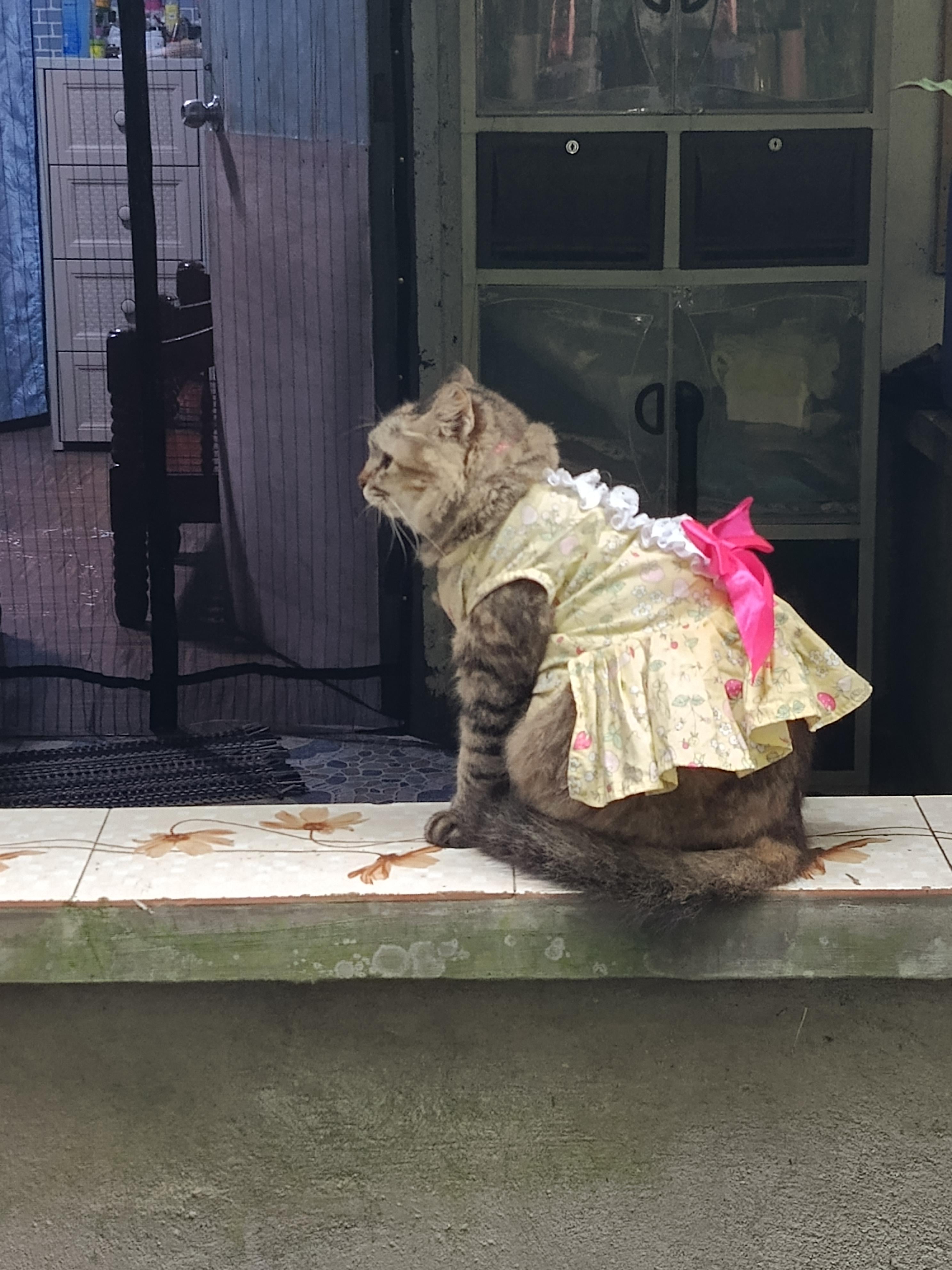 Neighbor's Cat, Riley patiently wearing her dress like the elegant lady she is 💛