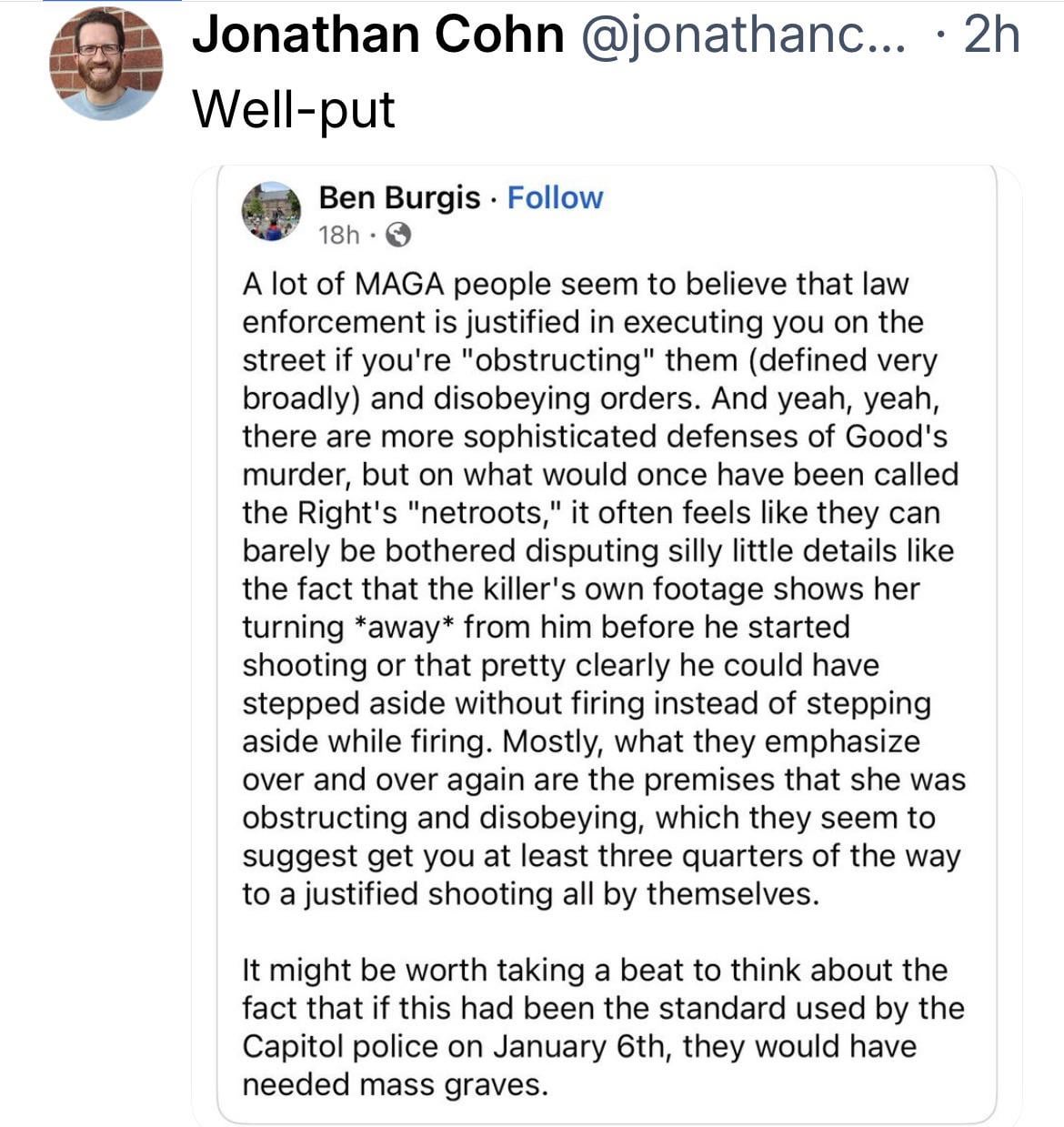 Law-enforcement engagement rules. Renee Good vs. Jan 6 rioters.