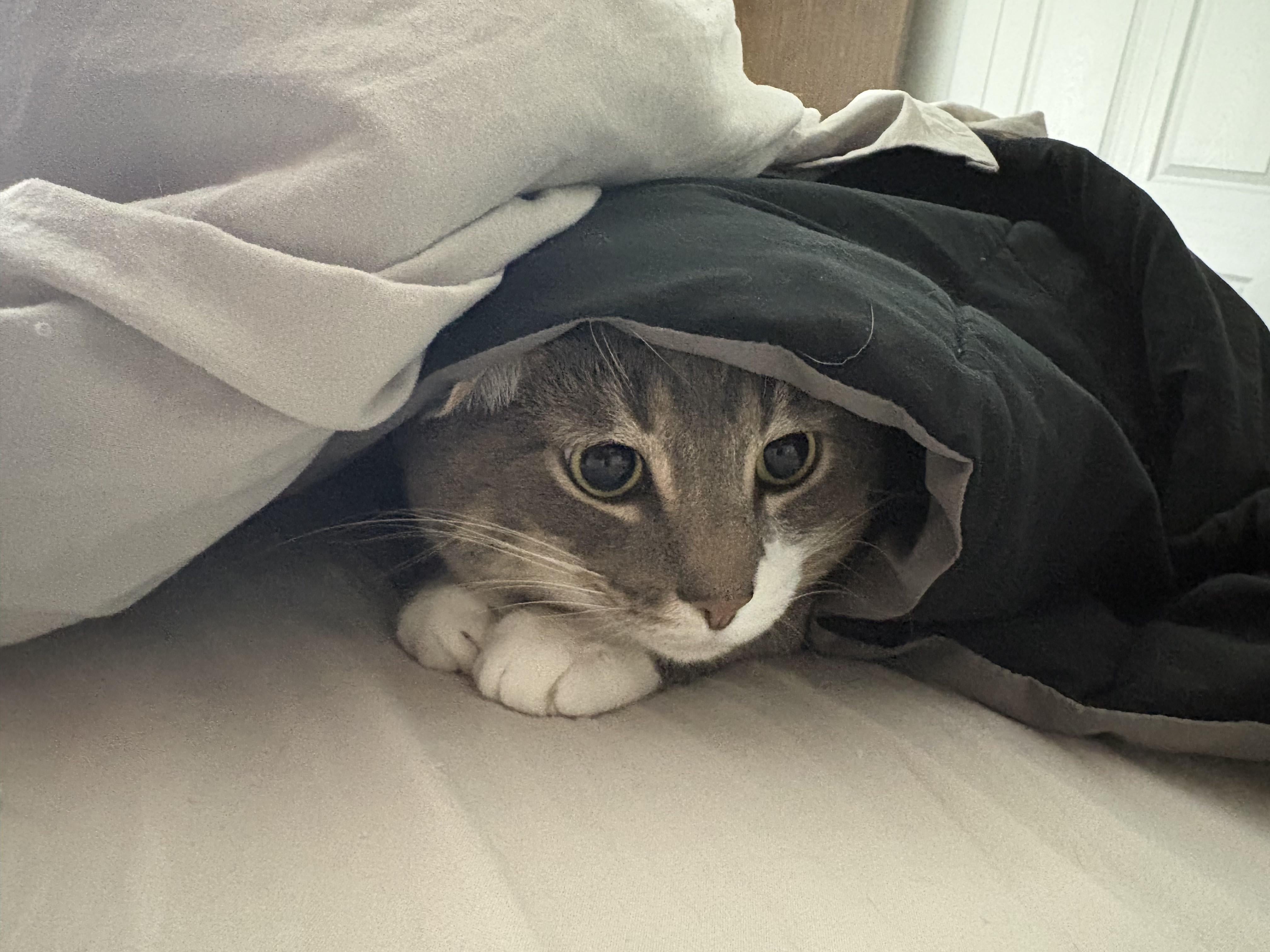 Sometimes he hides in the covers to nap, and sometimes it’s to have a tiny existential crisis.
