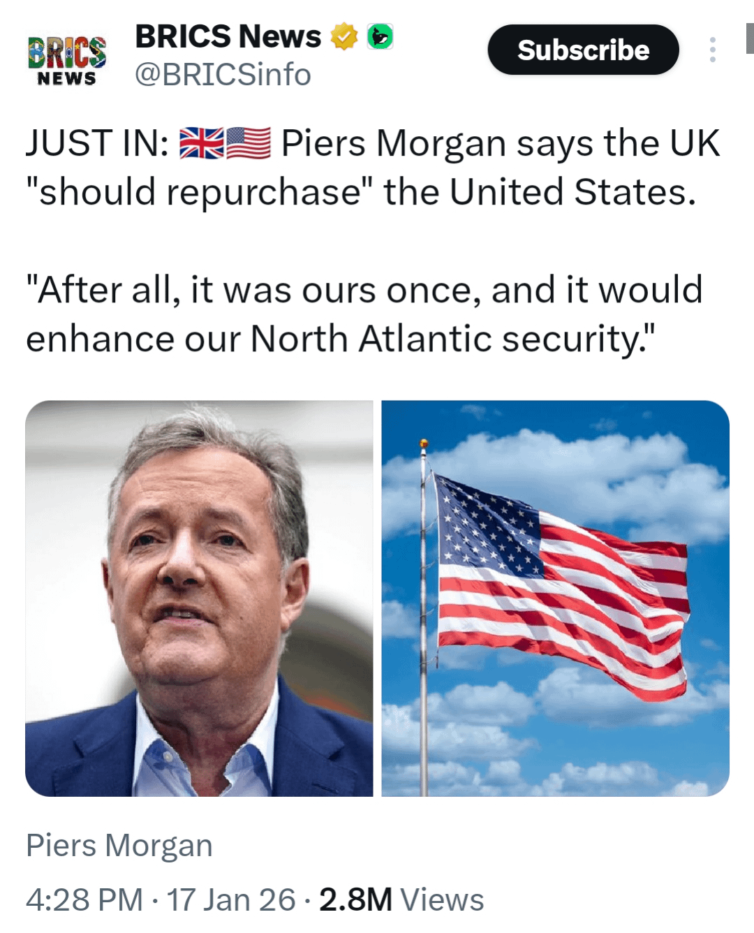 Piers Morgan says the UK "should repurchase" the United States.