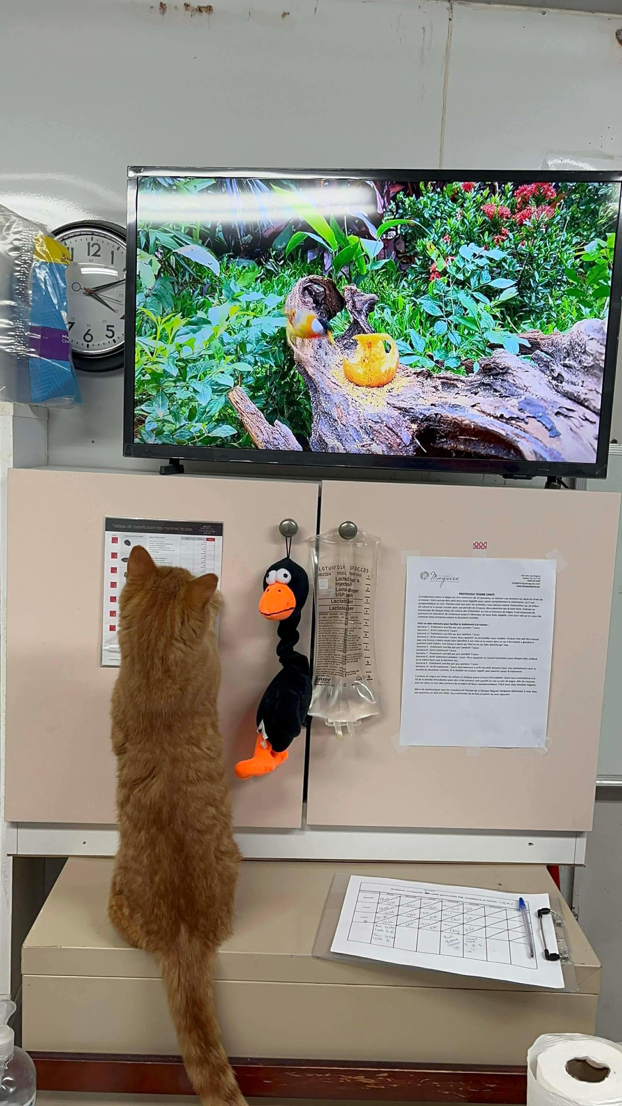 A generous person gave our shelter a tv so the cats in the contagion room could watch the birds/squirrels. Gustave approves. (He’s not sick anymore)