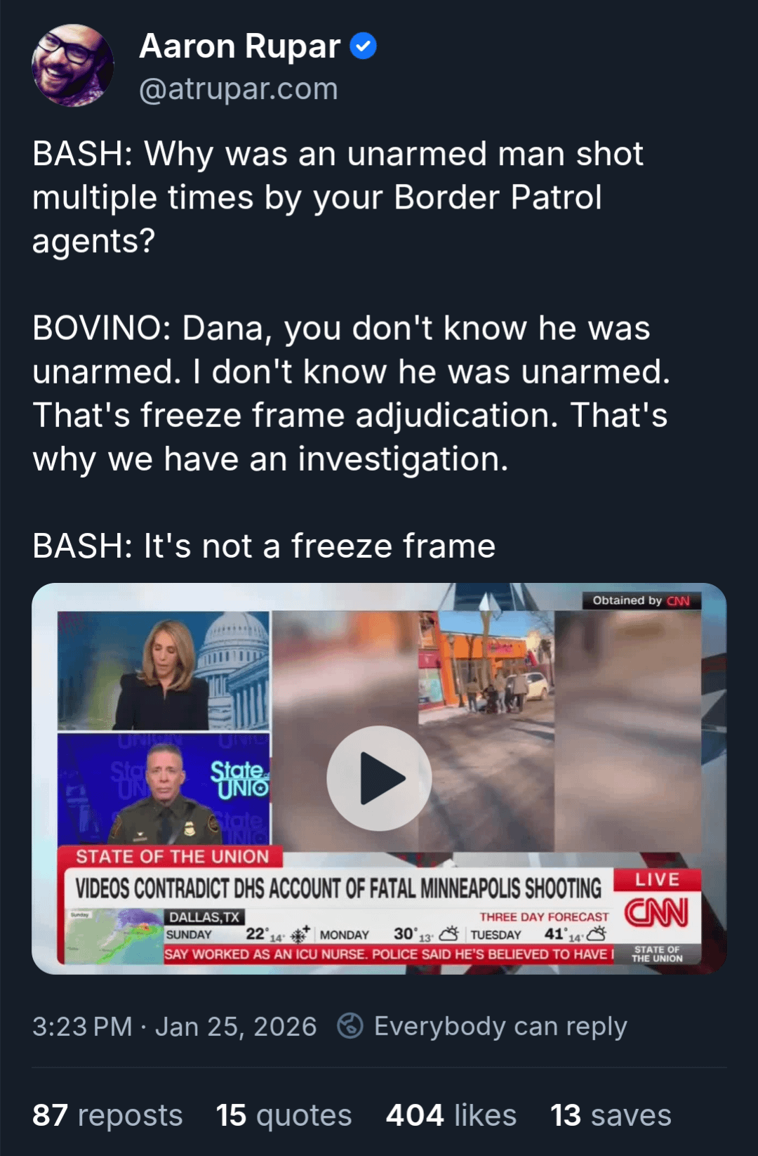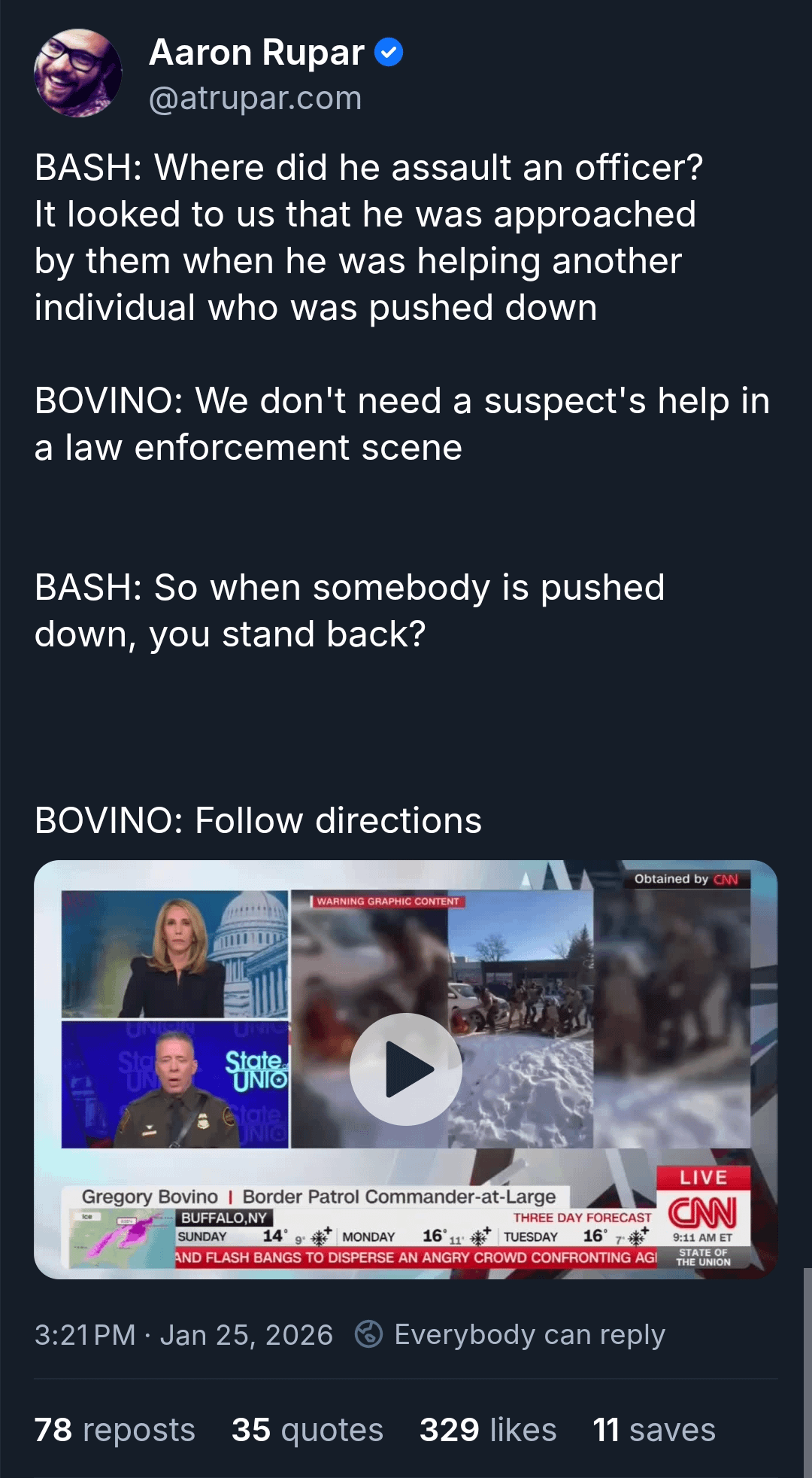 They will lie about it into infinity. It doesn't matter what video evidence shows, they will lie and tell you that you can't believe your eyes. Those who live on solely on a diet of right wing media will insist that Bovino, trump and their ilk are right despite evidence to the contrary.