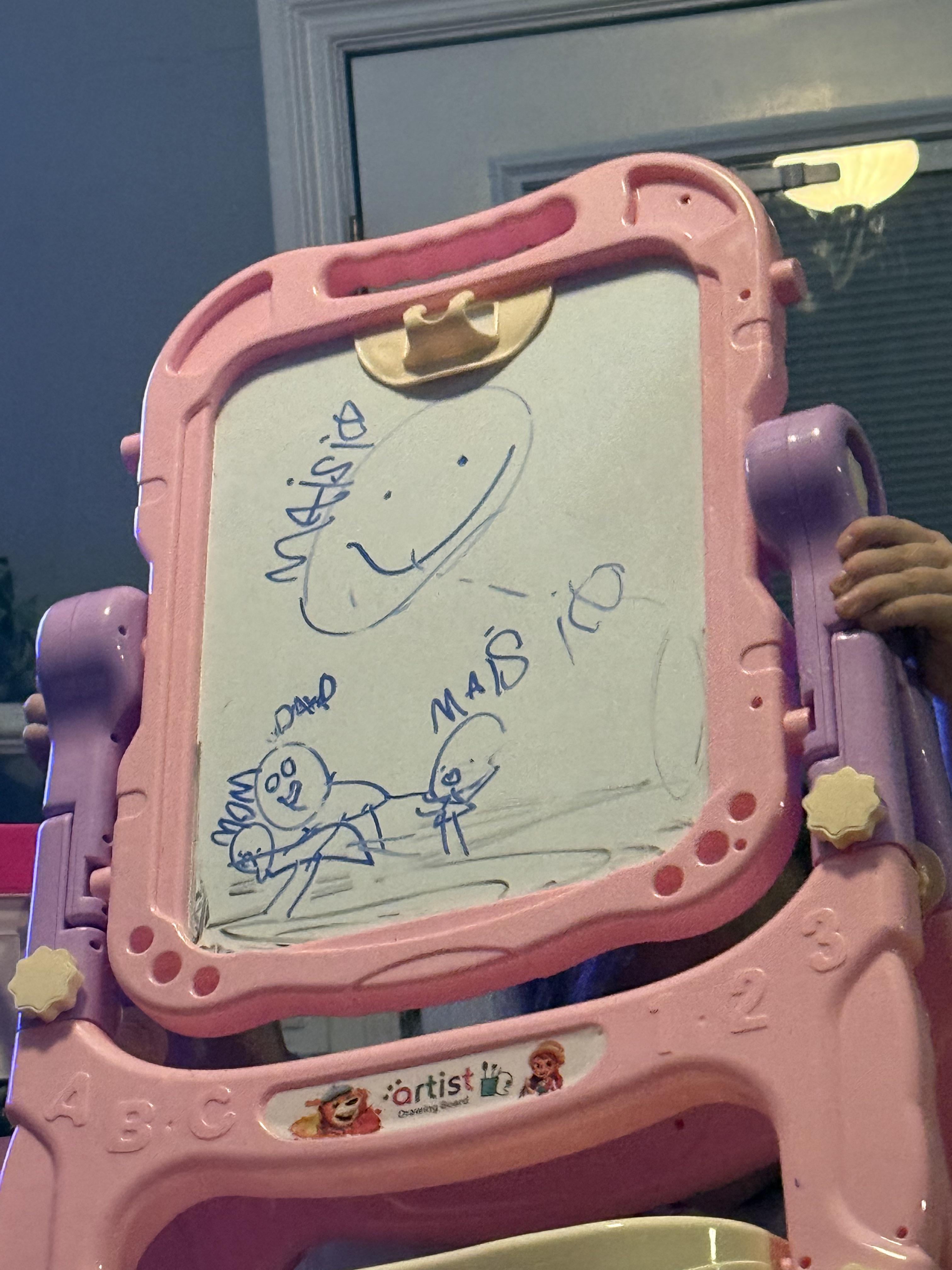 My husband was laying on top of me (non inappropriate way) because his weight calms my nervous system. My 6yo daughter drew this and I can’t stop laughing.