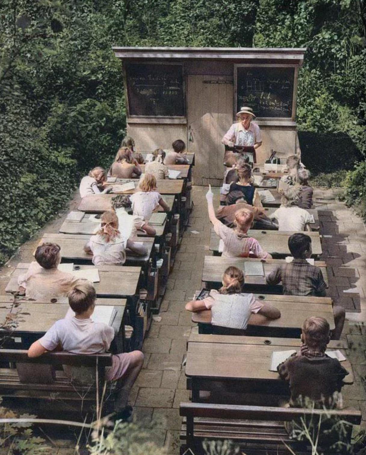 An open air school in 1957, Netherlands In the beginning of the 20th century a movement towards open air schools took place in Europe. Classes were taught in forests so that students would benefit physically and mentally from clean air and sunlight