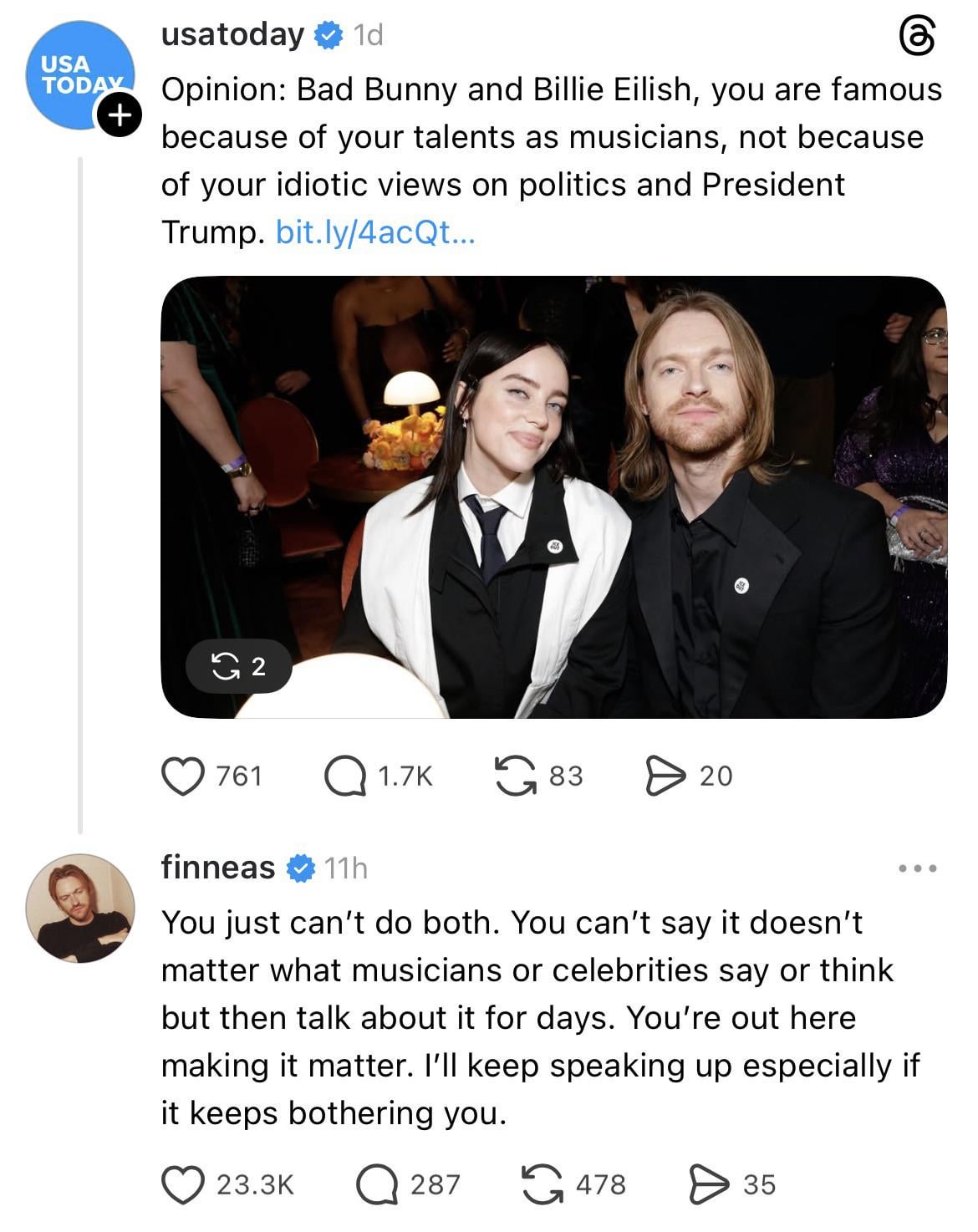 FINNEAS responds to a USA Today piece calling celebrity opinions on politics “idiotic”: “You can’t say it doesn’t matter what musicians or celebrities say or think but then talk about it for days. You’re out here making it matter. I’ll keep speaking up especially if it keeps bothering you.”