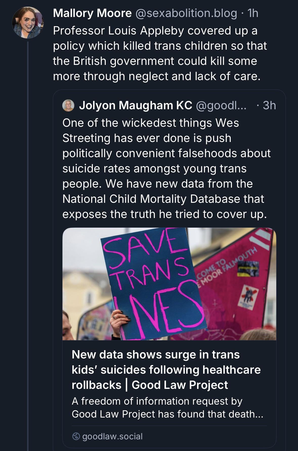 Denial of gender affirming care kills people, especially children. Conservatives know about this, and it’s the main reason why they want to deny gender affirming care to trans people