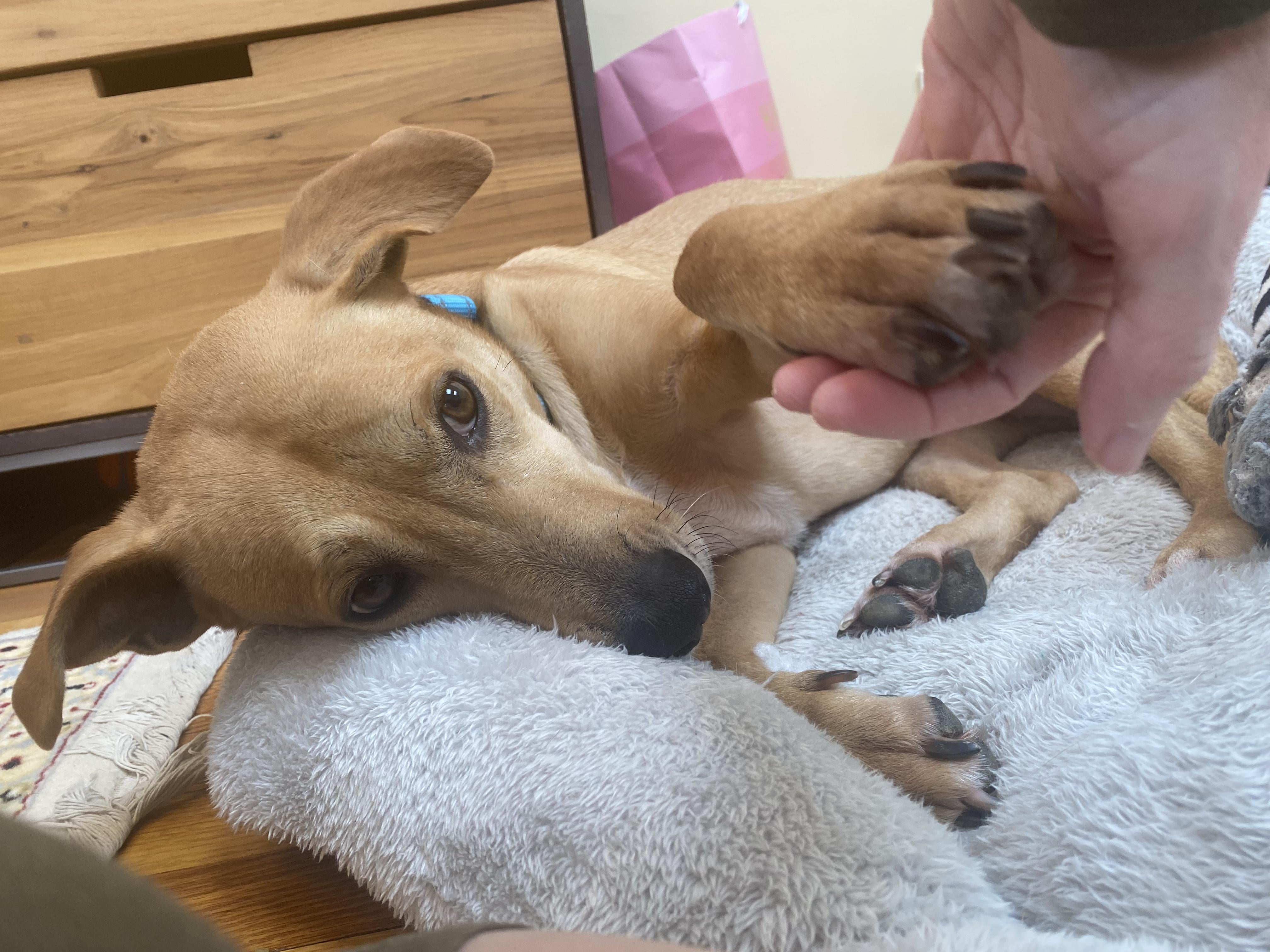 Nellie likes to hold hands. We adopted her 4 weeks ago.
