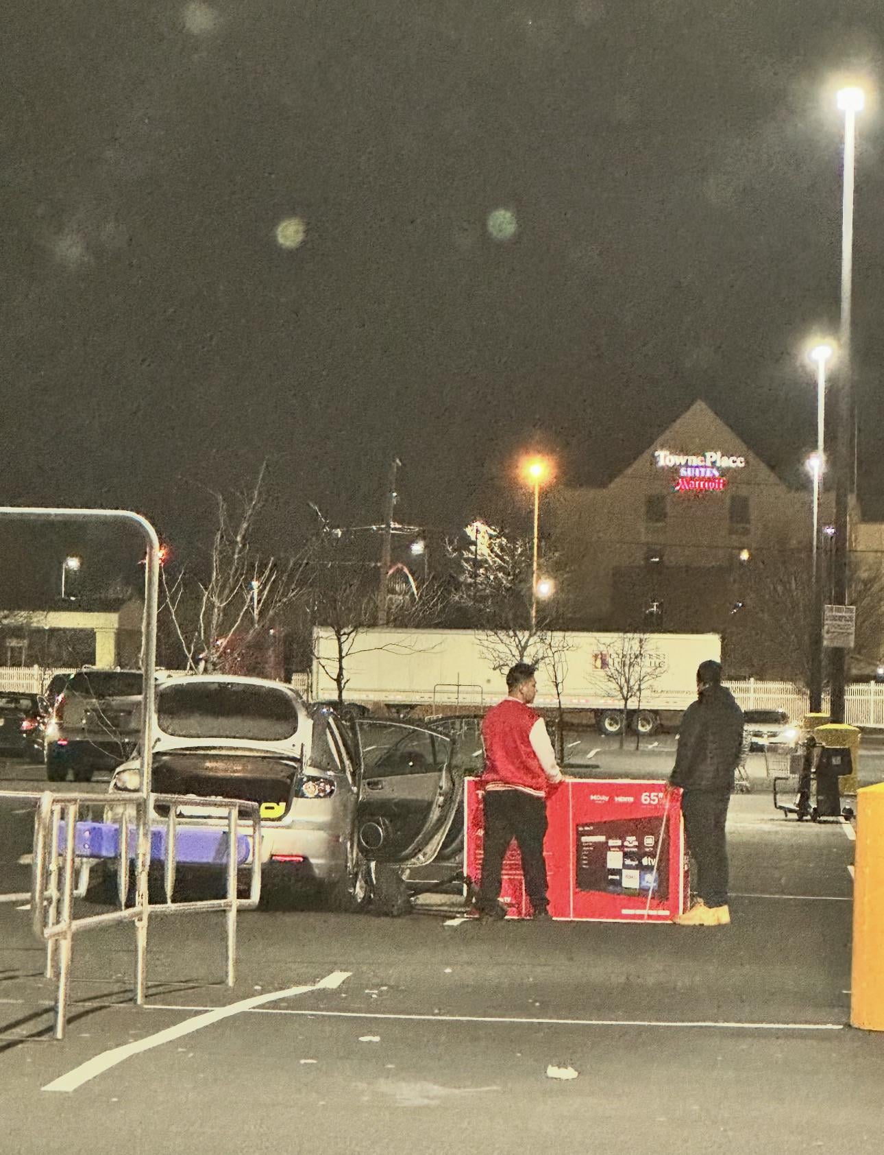 Saw these two scratching their heads trying to figure out how to fit this 65inch tv in a small car…