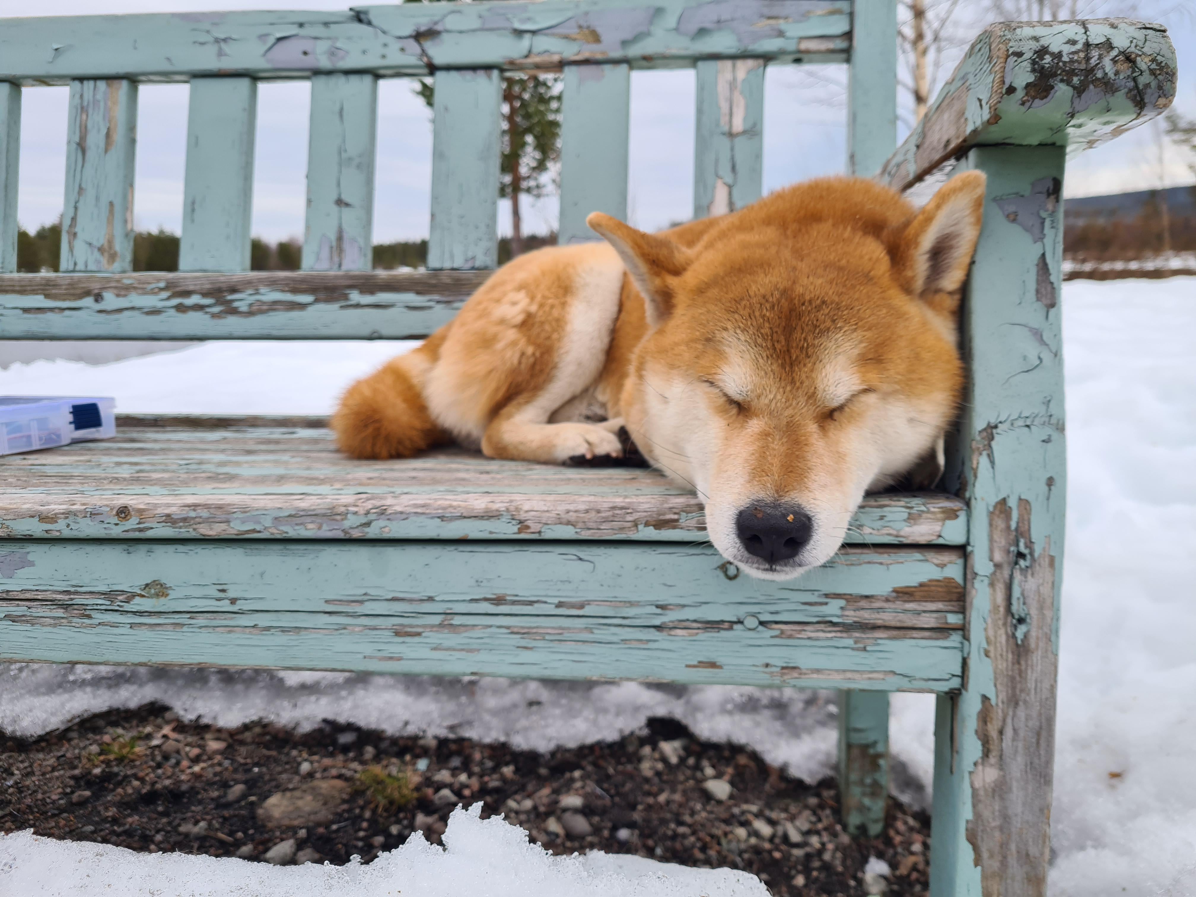 Kosmo enjoying a snooze on a bench