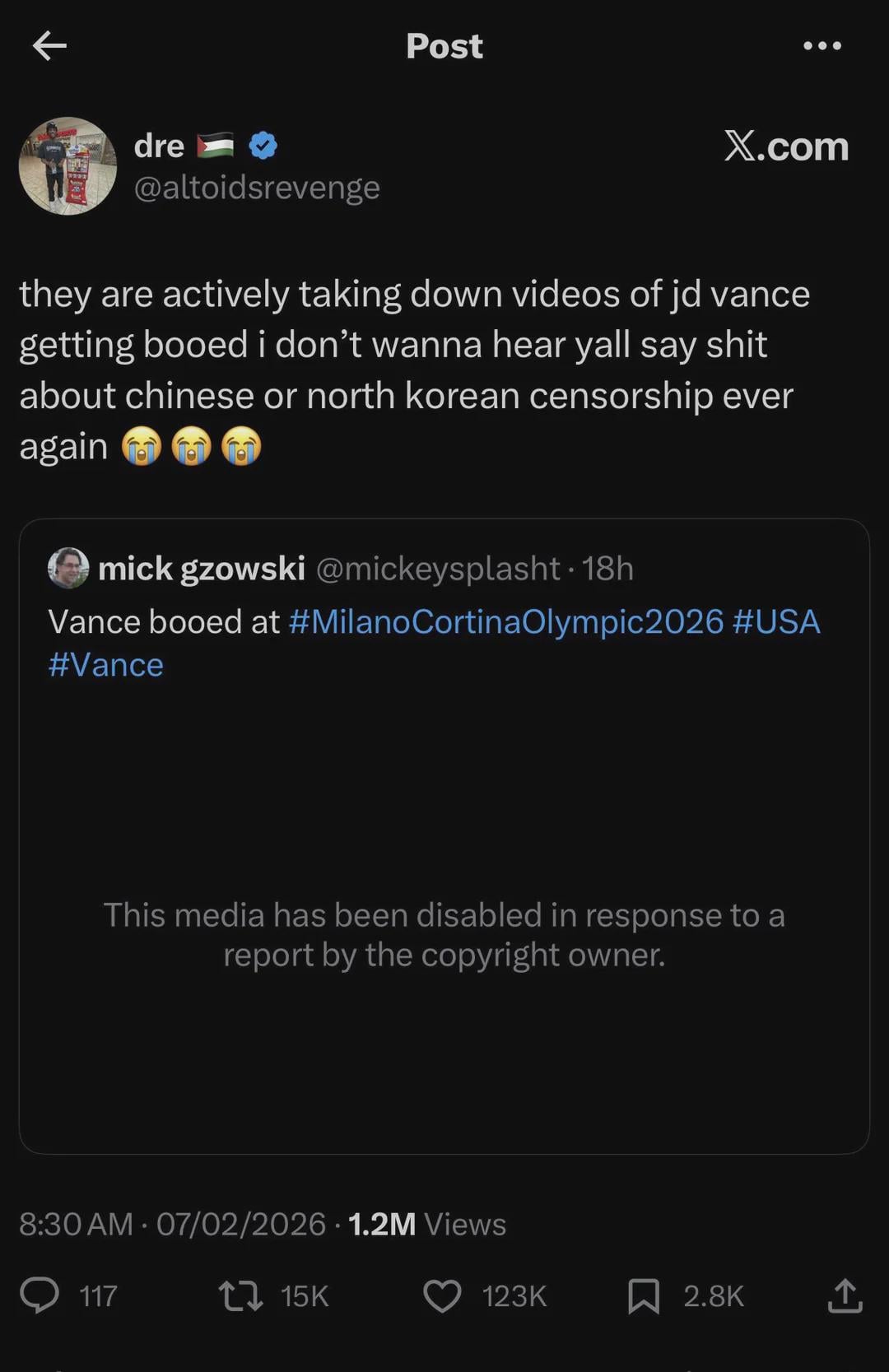 X actively took down videos of JD Vance being booed in the Winter Olympics.