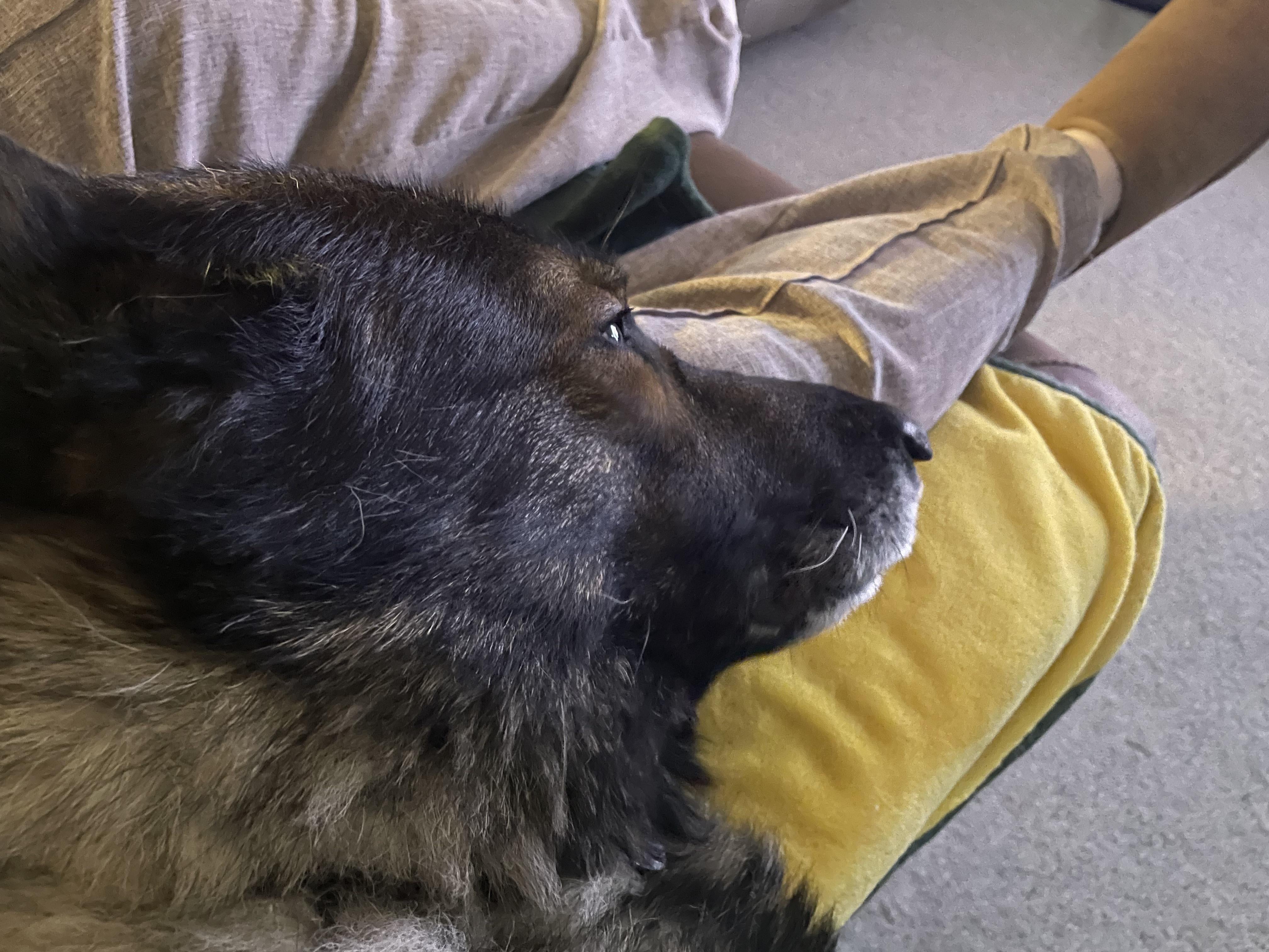 My snuggle buddy. German Shepherd I’ve had since 6 weeks old . He’s 11years old now. He lays his head on me ALOT 🥰