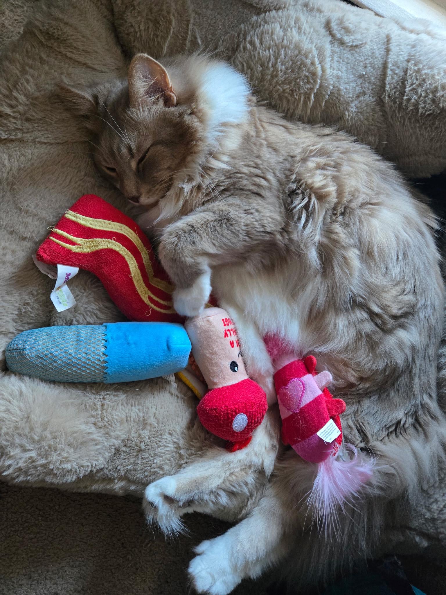 Vader likes to sleep amongst his toys.