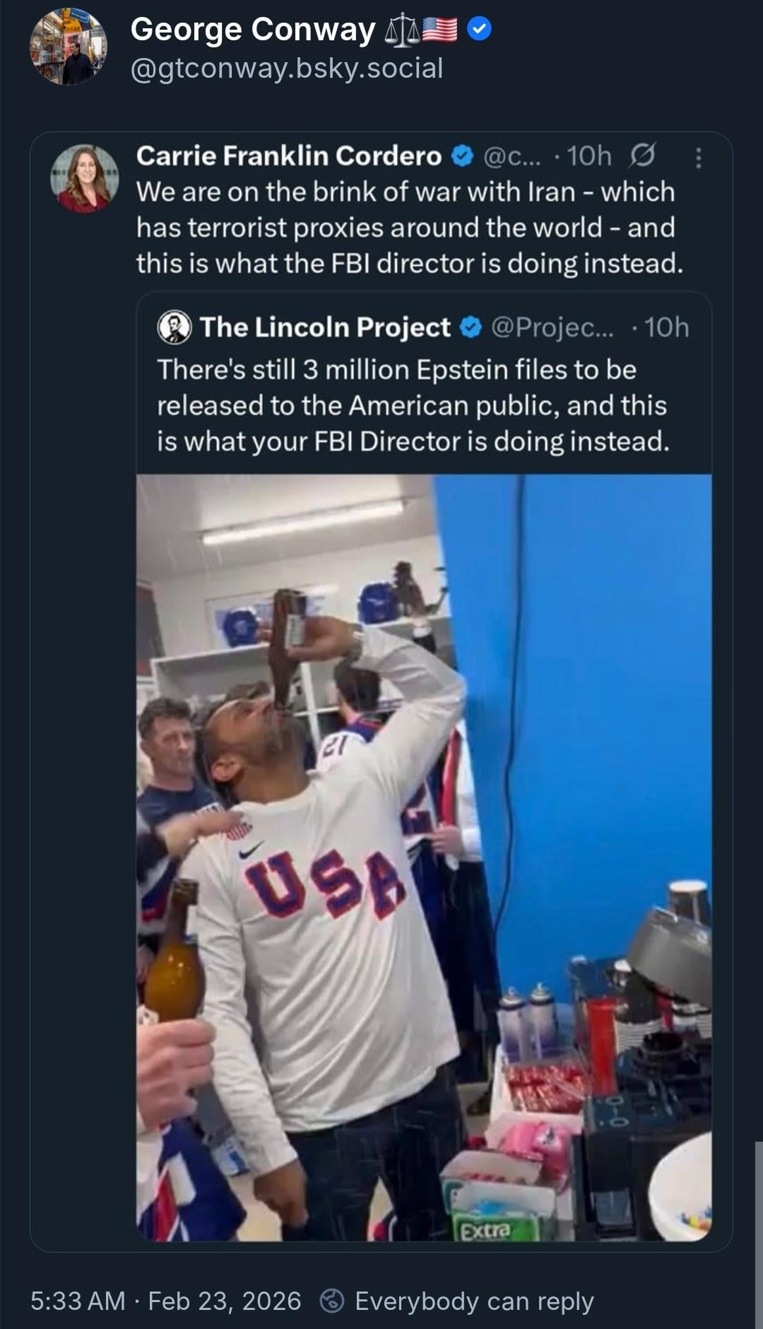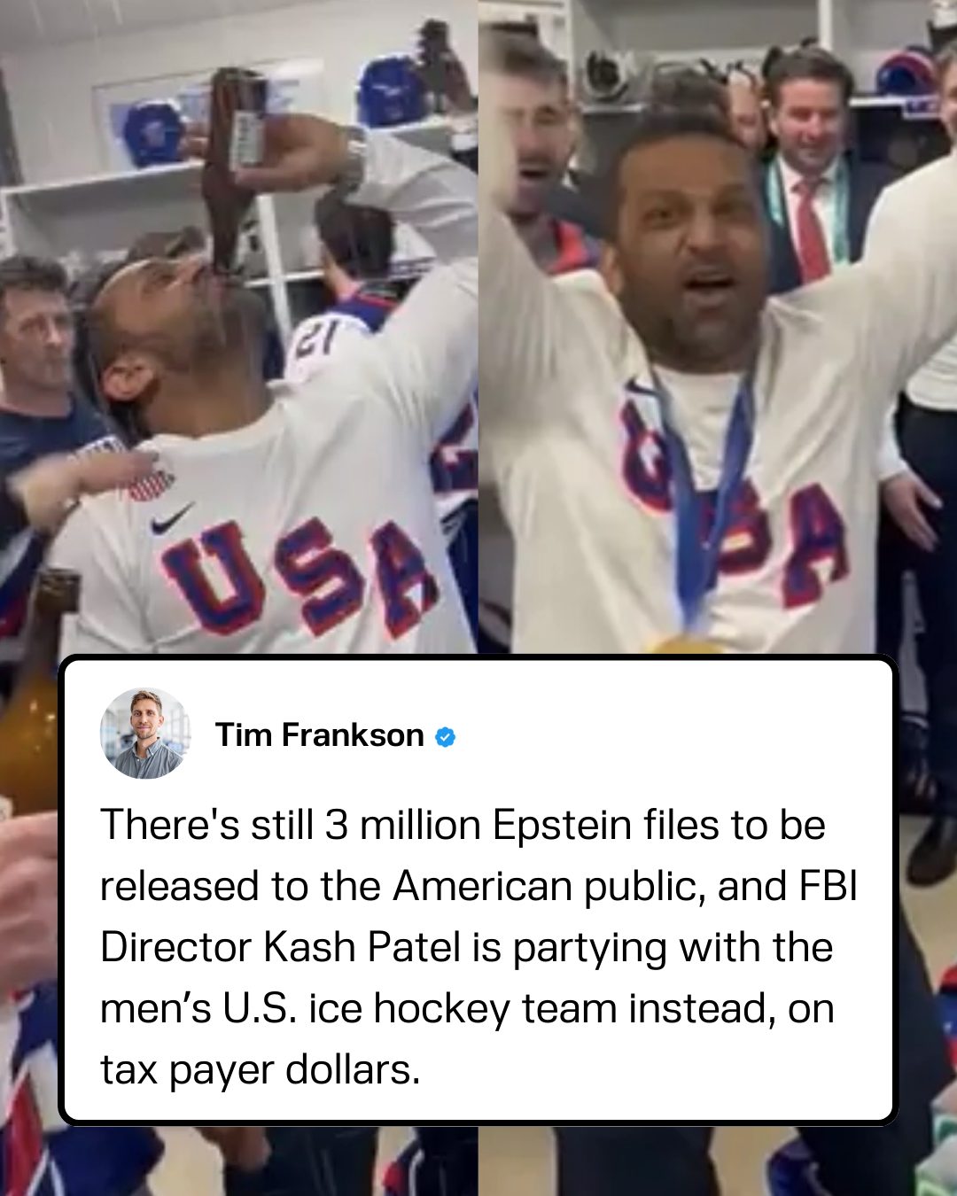 FBI Director Kash Patel has caused a stir after footage surfaced of him partying with the men's U.S. ice hockey team in their locker room following their win against Canada at the Winter Olympics in Italy. Patel posted a response on his personal X account, stating, “For the very concerned media – yes, I love America and was extremely humbled when my friends, the newly minted Gold Medal winners on Team USA, invited me into the locker room to celebrate this historic moment with the boys- Greatest country on earth and greatest sport on earth."