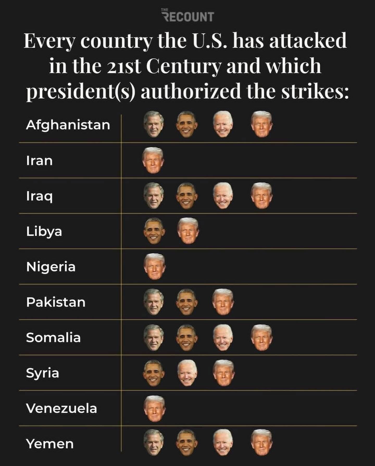 • A cool guide of every country the U.S. has attacked in the 21st Century and which president(s) authorized the strikes