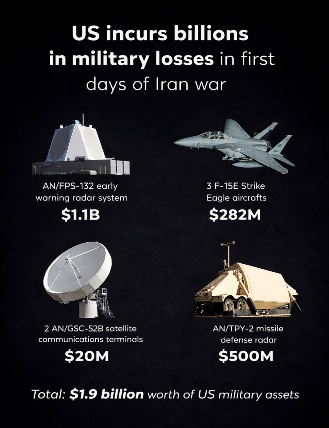 • Reports estimate the United States has lost nearly $2 billion worth of military equipment since February 28 amid escalating conflict involving United States, Israel, and Iran.
