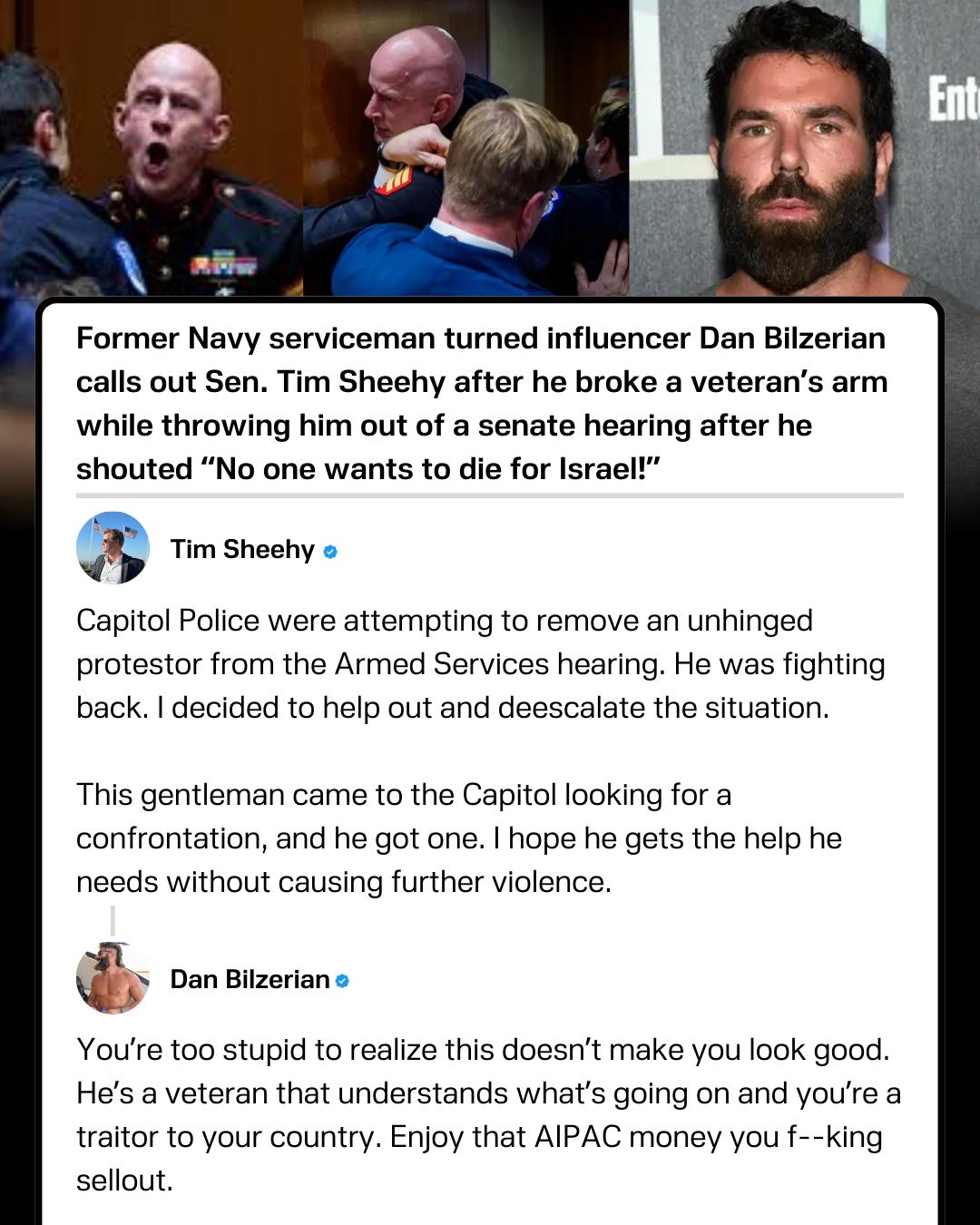 Dan Bilzerian has hit out at Sen. Tim Sheehy after he tried to defend dragging veteran Brian McGinnis out of a senate hearing for shouting "No one wants to die for Israel!" - breaking his arm in the process.