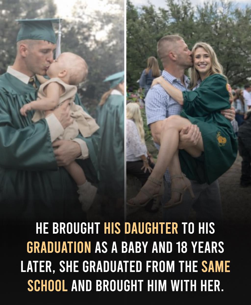 Now, at the same school, she stands in the same green gown—graduating while he proudly watches.