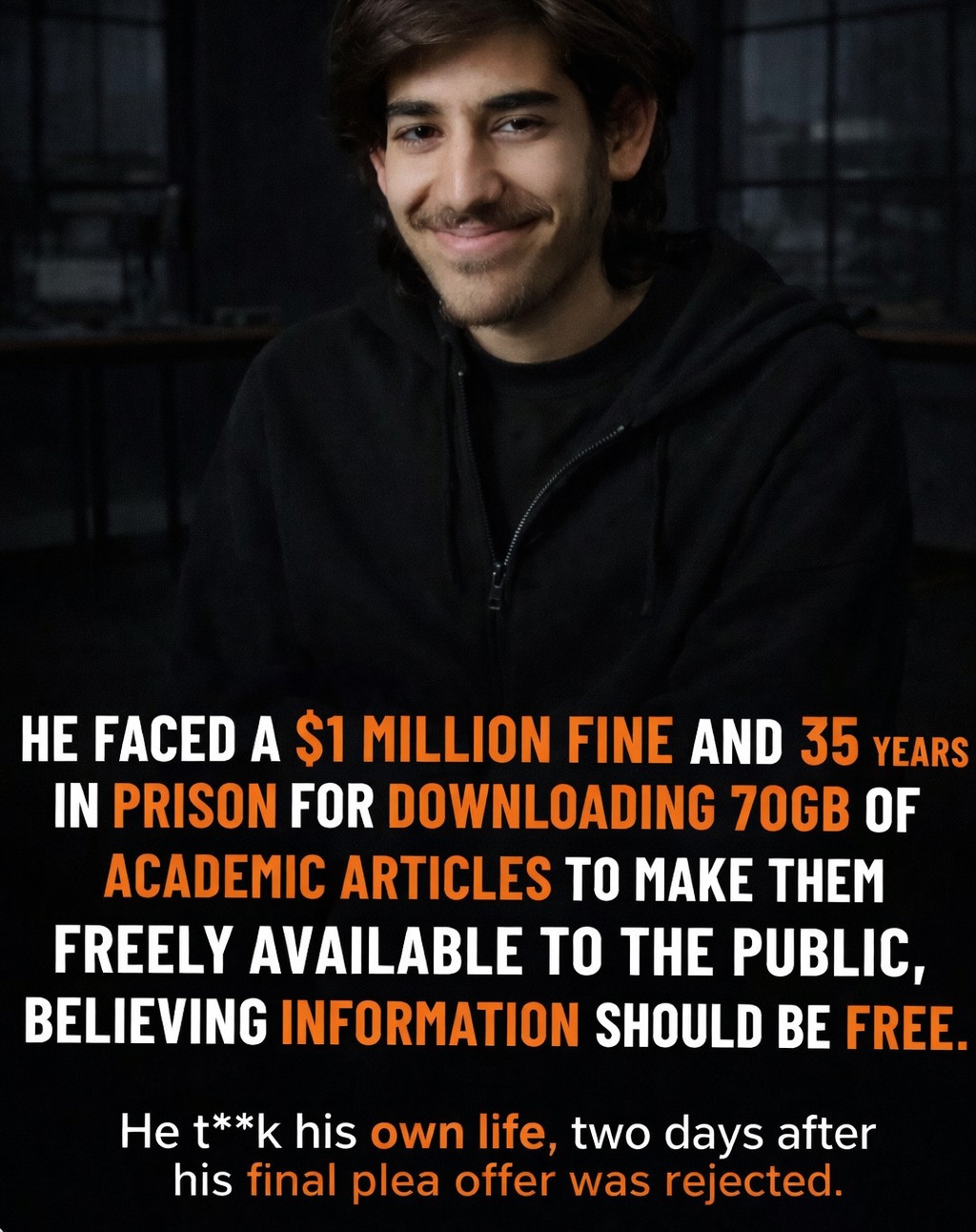 But none of it could bring him back.Aaron Swartz was only 14 when he helped create RSS, the technology behind how millions subscribe to content online. By 19, he had helped launch Reddit. By 24, he was a research fellow at Harvard University studying political corruption. But he believed something simple: knowledge funded by the public should be free for everyone. In 2010–2011, he downloaded about 4.8 million academic articles from JSTOR through Massachusetts Institute of Technology’s network. His intention was believed to be making research accessible instead of locked behind paywalls. Authorities intervened. Swartz was arrested and later charged by federal prosecutors with multiple felonies, including wire fraud and computer fraud — charges carrying a possible 35 years in prison and $1 million in fines. JSTOR itself declined to pursue charges after the data was returned, but the case continued. Swartz had previously spoken publicly about struggling with depression. His lawyers tried to negotiate a plea deal, but the legal fight dragged on. On January 11, 2013, Aaron Swartz tk his own life** in his Brooklyn apartment. He was 26 years old. His d**th triggered global backlash. Legal scholars, technologists, and activists questioned whether the case had been pursued too aggressively for a situation involving no financial profit and no direct victim. In the years that followed, MIT conducted an internal review, and JSTOR released millions of articles for free access in his memory. But none of it could bring him back.· 0 Comments ·0 Shares ·81 Views ·0 Reviews
