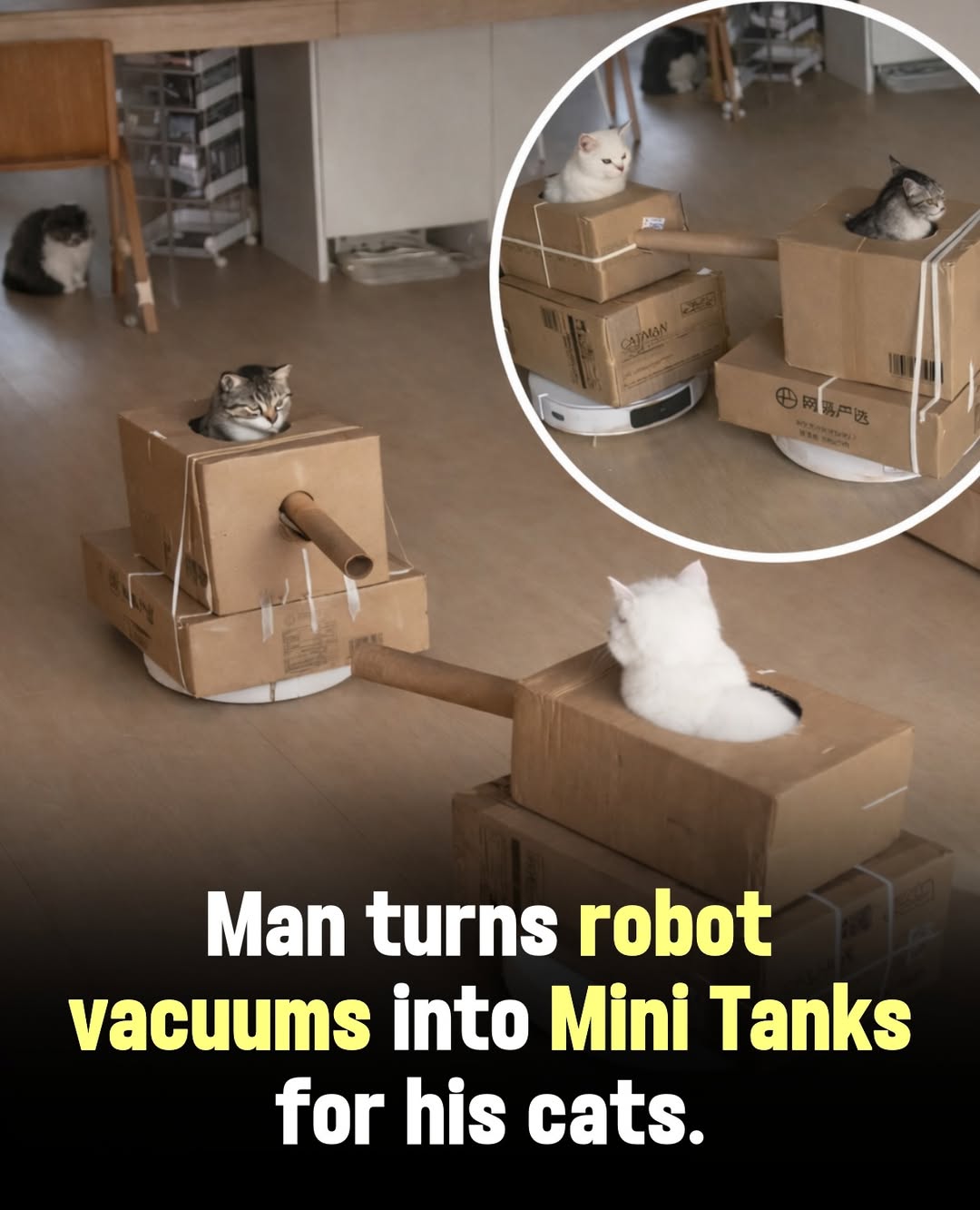 One creative cat owner turned robot vacuums into tiny moving tanks for his cats. With cardboard boxes and paper tubes, he built little turrets so the cats could ride around like commanders patrolling the house. The hilarious idea quickly went viral as cats calmly rolled through rooms like a miniature armored division. Now the real question is… are they just patrolling, or planning to take over the whole house?