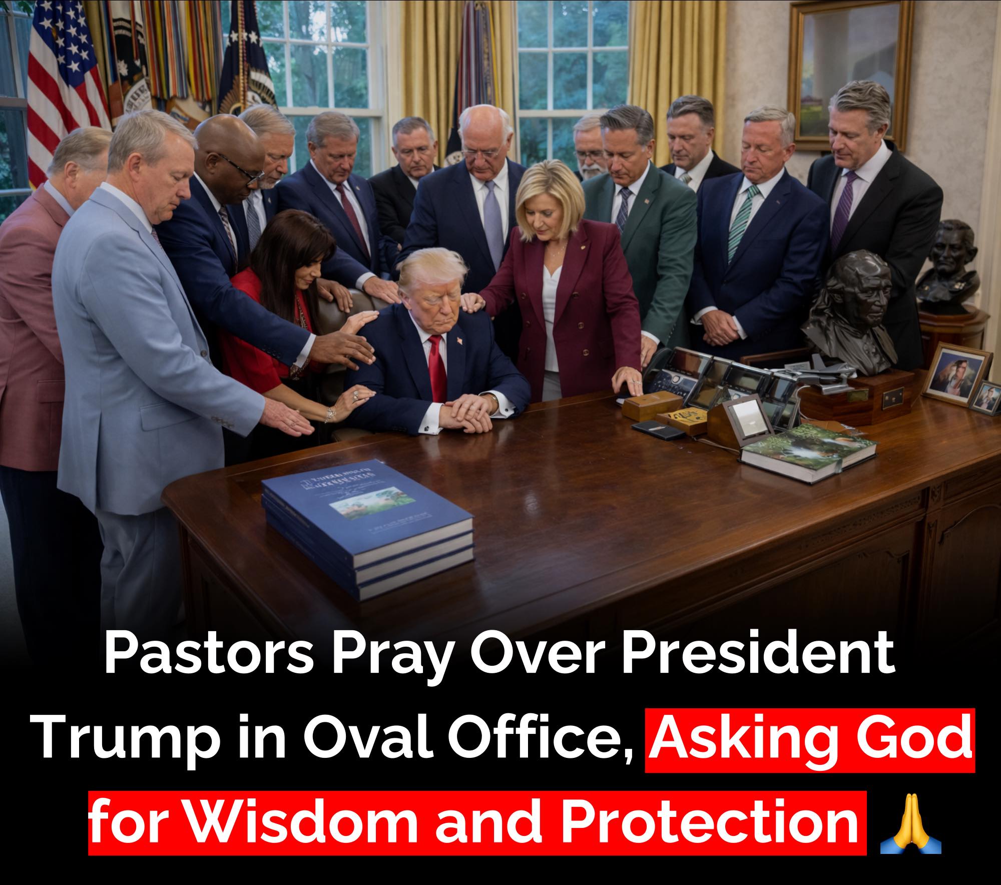 Christian pastors and faith leaders gathered in the Oval Office to pray for President Donald Trump, asking God for wisdom, protection, and strength in leading the nation. They also prayed for U.S. troops and God’s blessings on America.