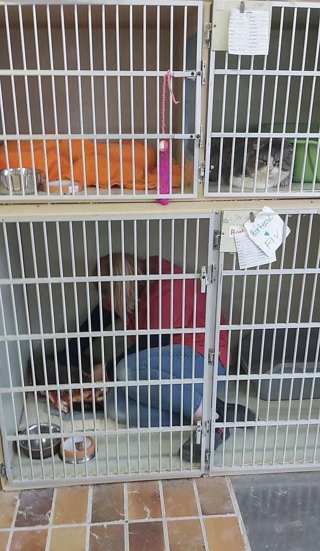 Émilie, the cat whisperer of our shelter, sometimes has to get to the cat to socialize them. That’s her with Hortense 😄