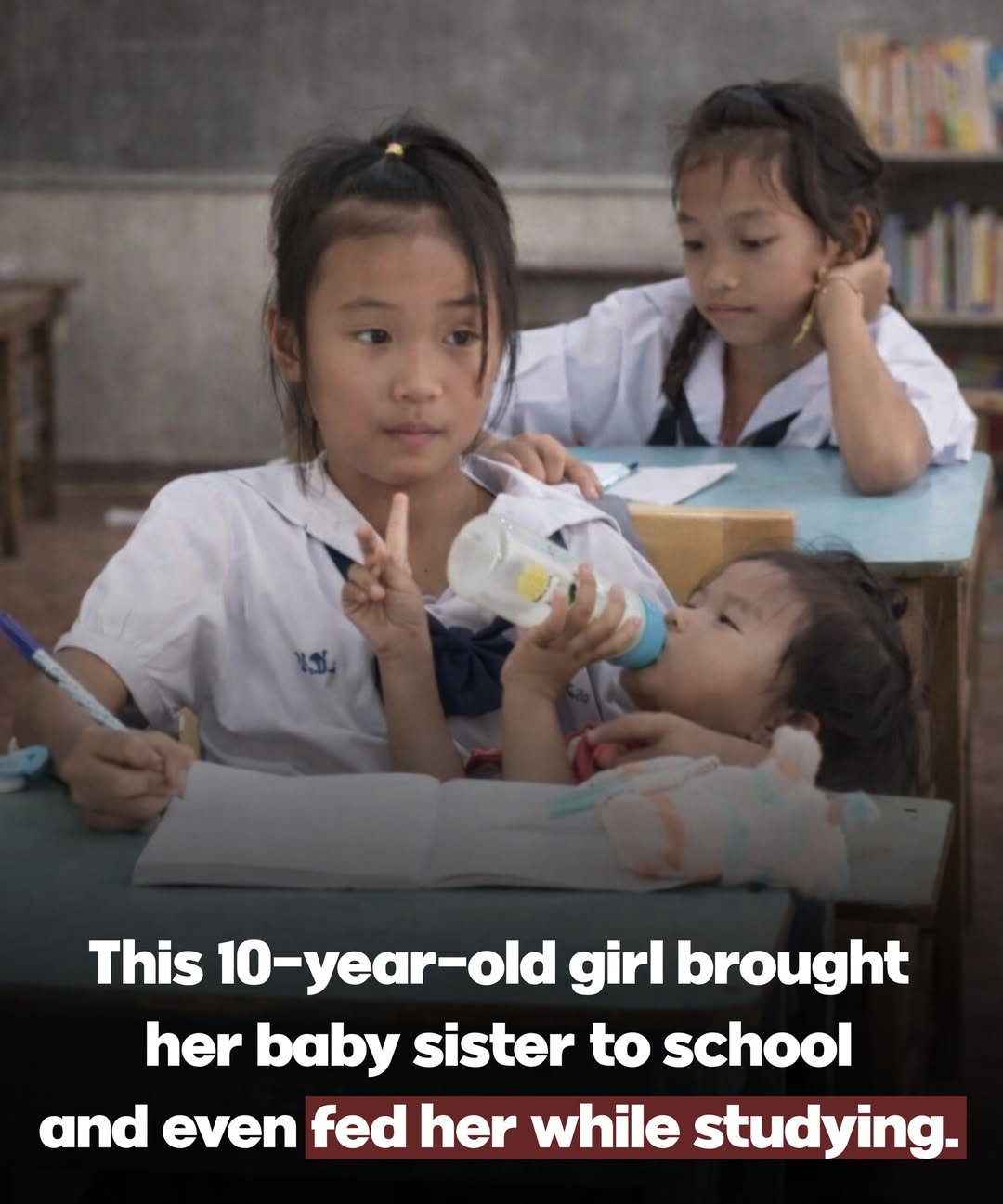 Instead of skipping class, she sat at her desk, listened to the lesson, took notes… and bottle-fed her sister at the same time.
