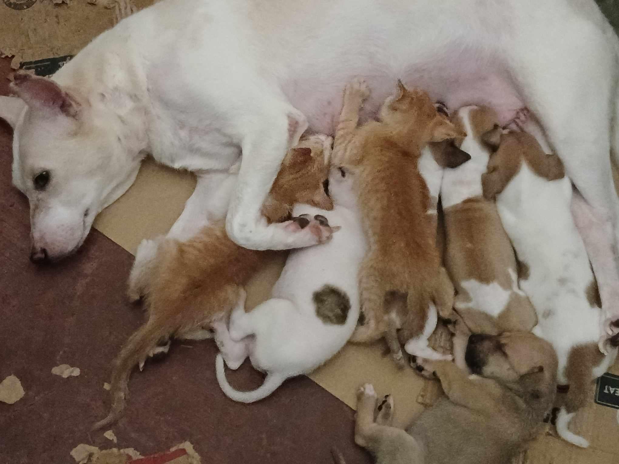 Dog mom nursing a kitten alongside her puppies.