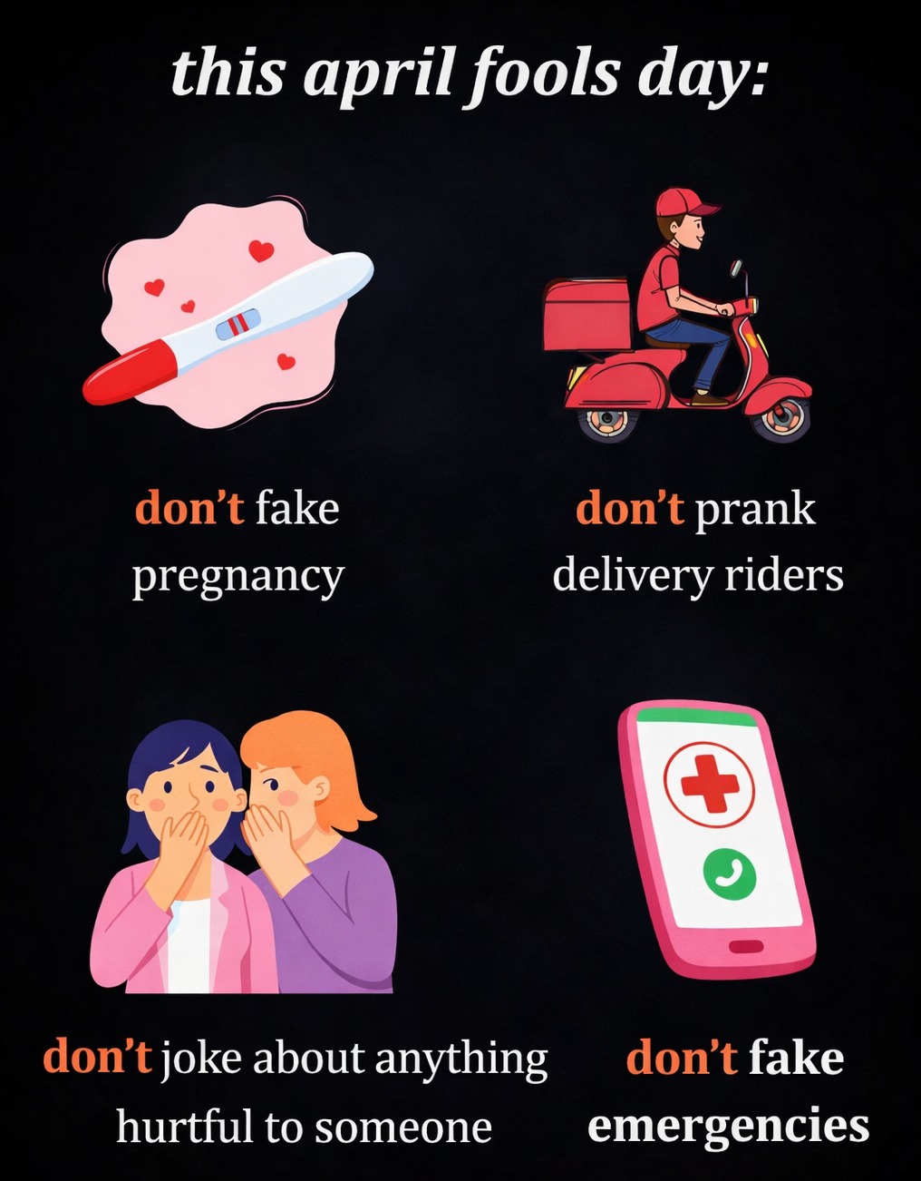 April Fools’ Day… but keep it kind Not every prank is funny. Some jokes can hurt, stress people out, or waste someone’s time — especially when it involves real-life situations. So today, remember: Be funny, not harmful Be creative, not careless Make people laugh… not uncomfortable Because the best jokes are the ones everyone can smile at