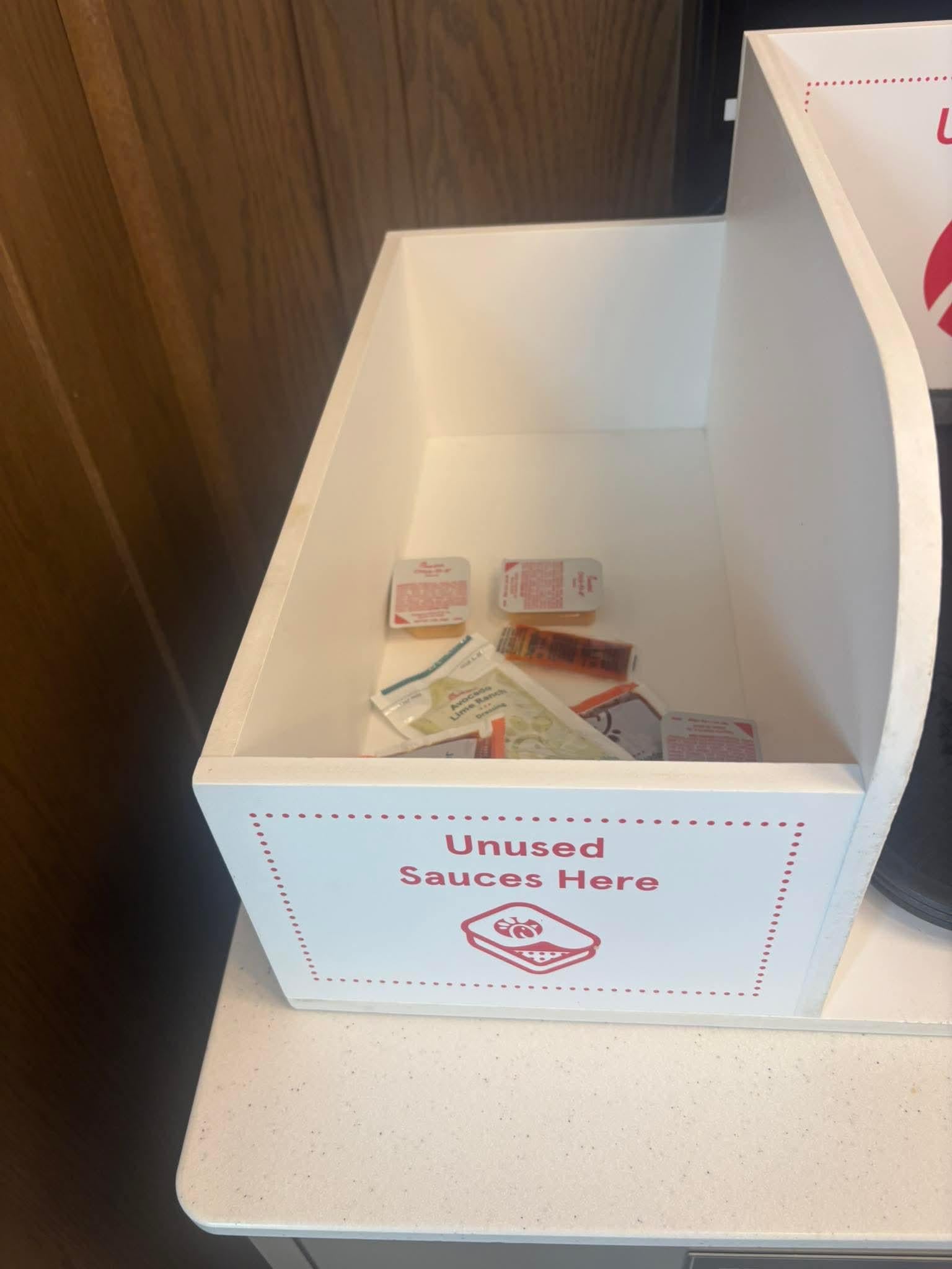 Chick Fil-A has an “unused sauces” bin on top of the trash can. It looks like they’re reusing them to save money