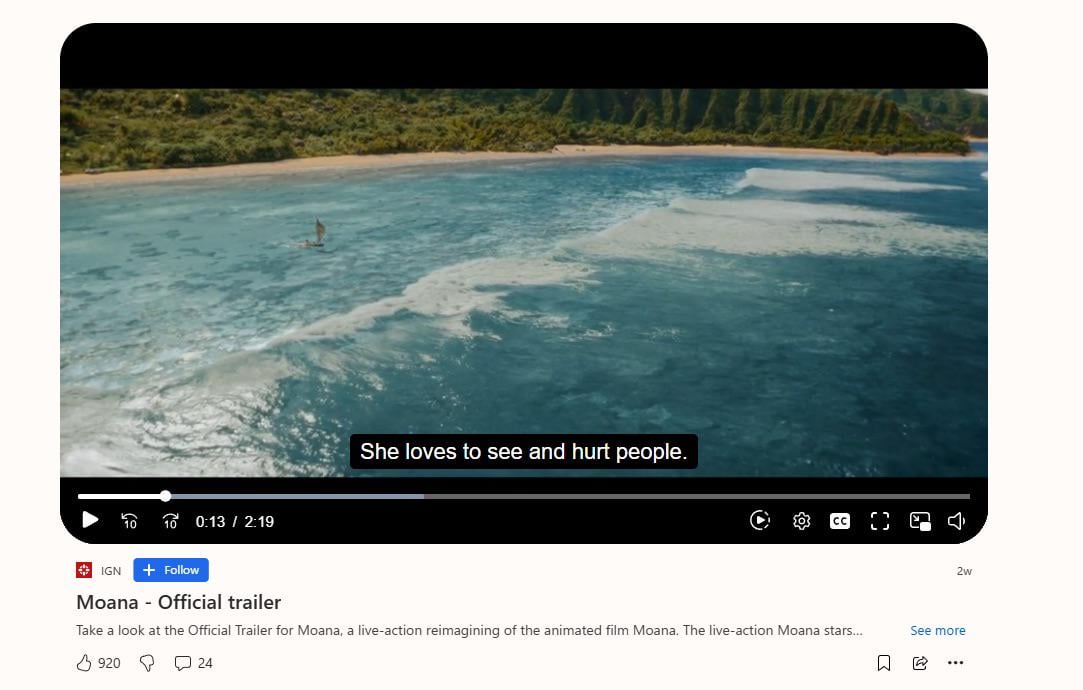The auto captions for the live action Moana Trailer are supposed to say 🎶 “she loves the sea and her people” 🎶