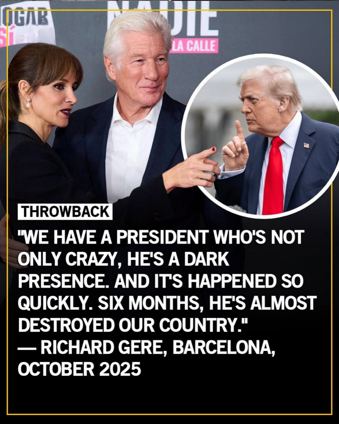 Having moved to Spain in 2024 to be with his wife Alejandra Silva, Gere has been outspoken about politics, previously describing Trump as "a bully and a thug" and warning the U.S. was "in a very dark place."