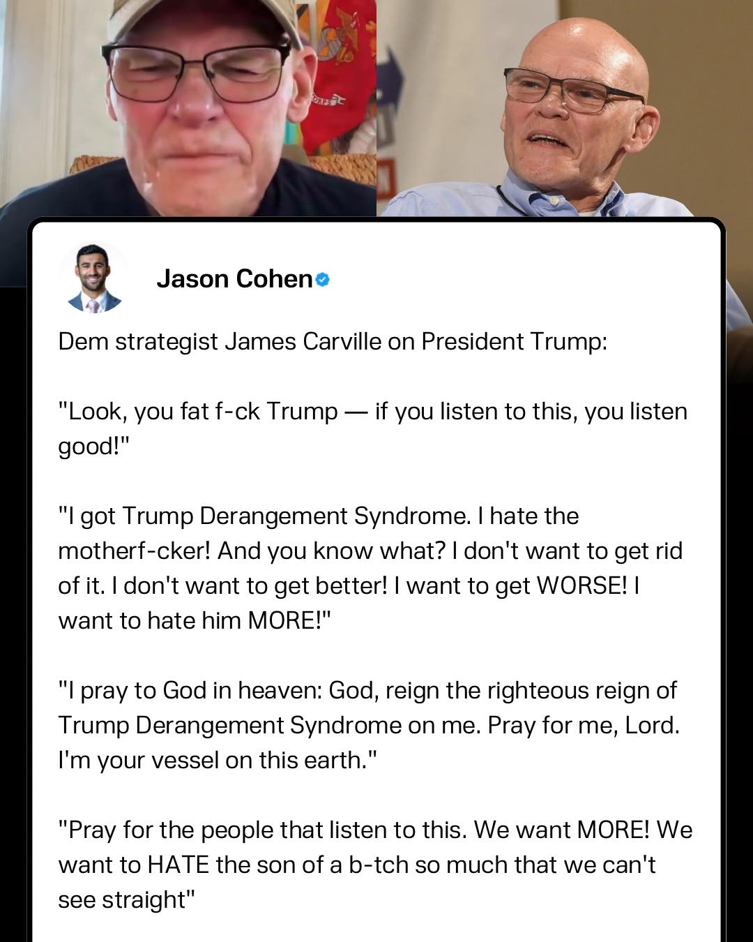 • James Carville just went on a furious rant against President Donald Trump, claiming he has TDS and he doesn’t want to be cured, he wants more.